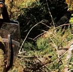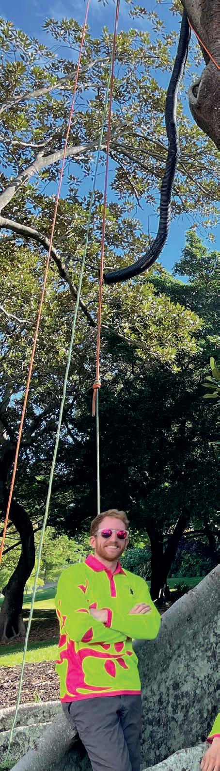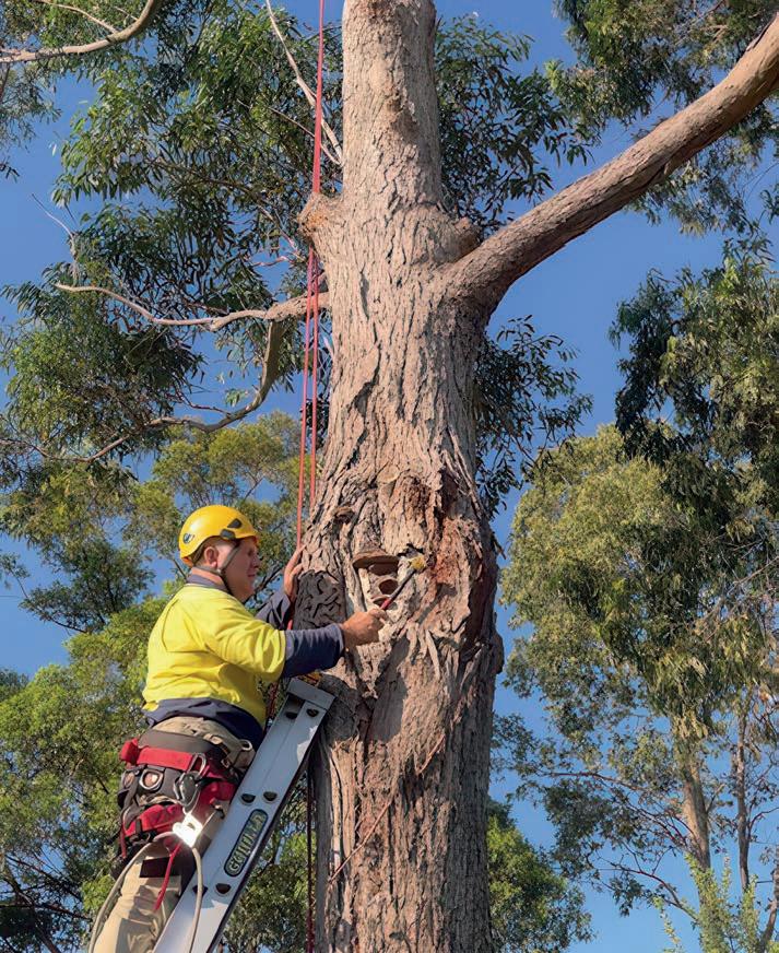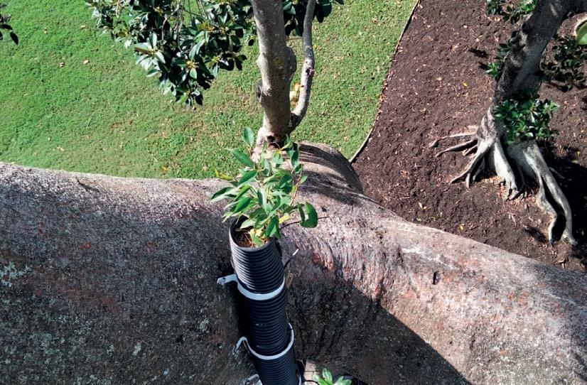 filled Agline pipe with irrigation line running from ground to the base of the basket, returning to install another pipe running 20m up the tree with a Weeping Fig in a 1.5m compost-filled sock of hessian. All installed by climbers, the pipes were filled at ground-level and hydrated/ activated by immersion in the parkland dam.