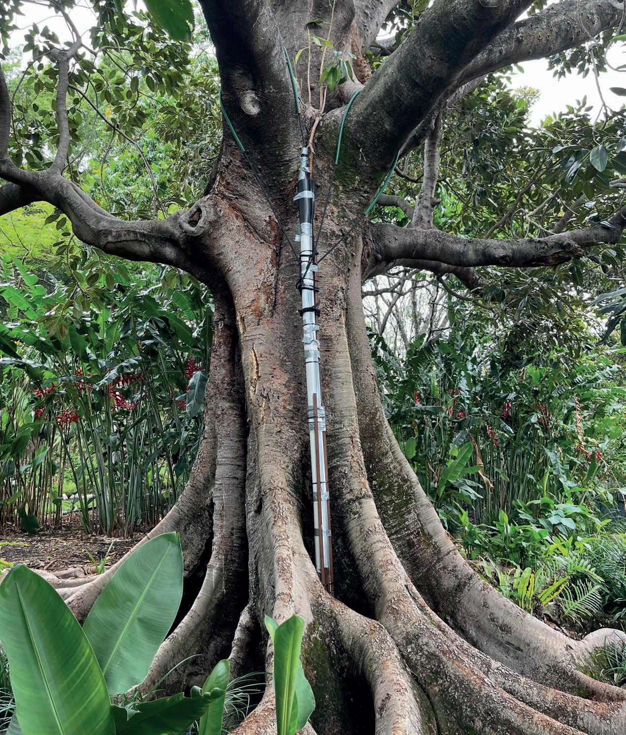 Initially we established an advanced grown Green leaf Moreton Bay fig (F. watkinsiana) via cage and coir burlaps into a wide fork 10m up the tree (refer to Figures 5-7). Then we ran a slotted 100mm cellulose/compost/probiotic