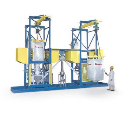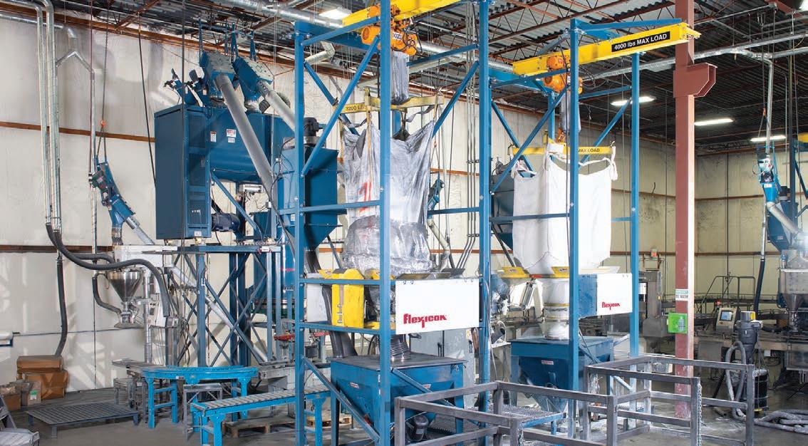 Dual SWING-DOWN® Bulk Bag Fillers fed by weigh hoppers fill up to 40 bags per hour with only one operator connecting empty bags and one forklift removing full bags.