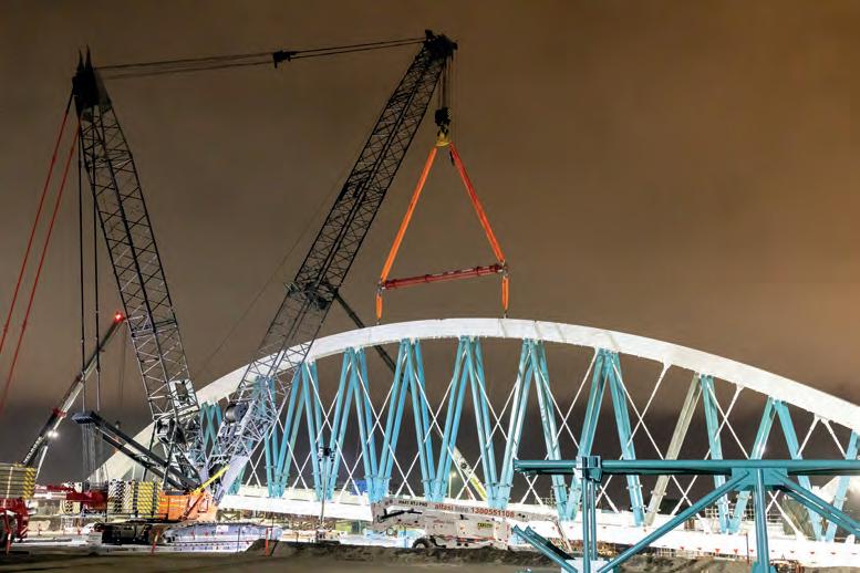 CRANES CONFIGURATION: Lifting the Super-T beams at a radius of 30 metres, with 45 metres of main boom with Y-Guy and 155 tonnes of counterweight.