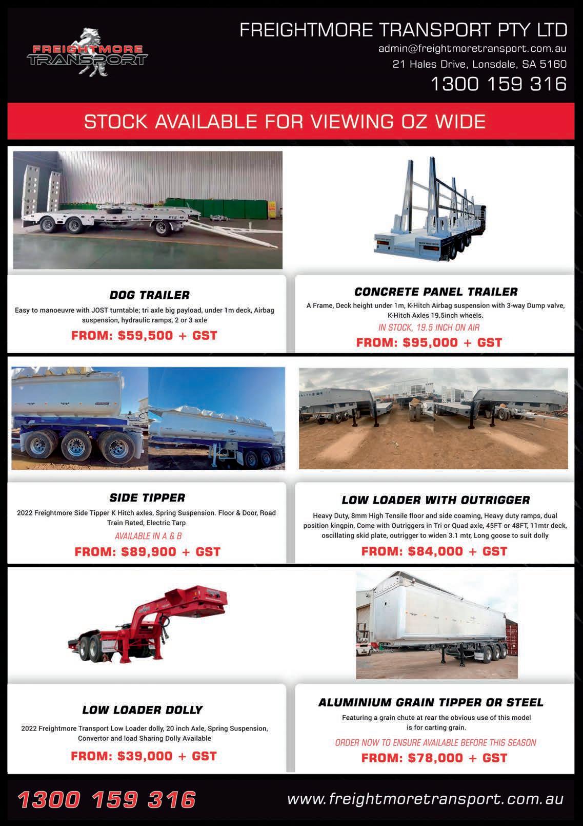 The publisher accepts no responsibility or liability for any losses incurred by a buyer responding to an advertisement in this magazine. Buyers are solely responsible for their own negotiations and transactions with advertisers. Prime Creative Media advises buyers beware of negotiating by email only; of paying deposits to private advertisers for goods unseen; of transferring money (for example via Western Union) interstate or overseas. Buyers should contact Prime Creative Media customer services on 1300 362 272 if they suspect an advertisement may be fraudulent. In the event that a buyer suffers financial loss as a result of responding to a private advertisement in this publication Prime Creative Media (The Publisher) shall not be held liable or responsible tradetrucks.com.au/sell 1300 362 272 privateads@primecreative.com.au www.tradetrucks.com.au/sell 1300 362 272 PRIVATE Advertising Powered by To select your advertising package, go to www.tradetrucks.com.au/sell Each package includes 1 print issue in Deals on Wheels and until sold on www.tradetrucks.com.au UPGRADE ............ $59 Upgrade Your Photo Advert In DealsonWheels to also appear In Owner Driver magazine as 1/28th Newsprint for 1 issue www.tradetrucks.com.au/sell 1300 362 272 PRIVATE Advertising www.tradetrucks.com.au/sell 1300 362 272 PRIVATE Advertising 2012 KENWORTH T909 2003, Cat C12, 18spd Eaton RTL016918B, Dana DSH40P diffs, Airglide 200 susp, alloy wheels, rebuild April 08, REG. STATE. DIYXXXXXX 03 8373 7112 $189,000 2012 KENWORTH T909 Cat C12, 18spd Eaton RTL016918B, Dana DSH40P diffs, rebuild April 08, REG. STATE. DIYXXXXXX. 03 8373 7112 $189,000 2012 KENWORTH T909 Cat C12, 18spd Eaton RTL016918B, Dana DSH40P diffs, rebuild April 08, REG. STATE. DIYXXXXXX. 03 8373 7112 $189,000 2012 KENWORTH T909 Cat C12, 18spd Eaton RTL016918B, Dana DSH40P diffs, rebuild April 08, REG. STATE. DIYXXXXXX 03 8373 7112 $189,000 2012 KENWORTH T909 Cat C12, 18spd Eaton RTL016918B, Dana DSH40P diffs, rebuild April 08, REG. STATE. DIYXXXXXX 03 8373 7112 $189,000 2012 KENWORTH T909 Cat C12, 18spd Eaton RTL016918B, Dana DSH40P diffs, rebuild April 08, REG. STATE. DIYXXXXXX 03 8373 7112 $189,000 2012 KENWORTH T909 Cat C12, 18spd Eaton RTL016918B, Dana DSH40P diffs, rebuild April 08, REG. STATE. DIYXXXXXX 03 8373 7112 $189,000 2012 KENWORTH T909 Cat C12, 18spd Eaton RTL016918B, Dana DSH40P diffs. REG. STATE. DIYXXXXXX 03 8373 711 $189,000 2012 KENWORTH T909 Cat C12, 18spd Eaton RTL016918B, Dana DSH40P diffs. REG. STATE. DIYXXXXXX 03 8373 711 $189,000 2012 KENWORTH T909 Cat C12, 18spd Eaton RTL016918B, Dana DSH40P diffs. REG. STATE. DIYXXXXXX 03 8373 711 $189,000 2012 KENWORTH T909 Cat C12, 18spd Eaton RTL016918B, Dana DSH40P diffs. REG. STATE. DIYXXXXXX. 03 8373 711 $189,000 2012 KENWORTH T909 Cat C12, 18spd Eaton RTL016918B, Dana DSH40P diffs. REG. STATE. DIYXXXXXX 03 8373 711 $189,000 2012 KENWORTH T909 2003, Cat C12, 18spd Eaton RTL016918B, Dana DSH40P diffs, Airglide 200 susp, alloy wheels, rebuild April 08, REG. STATE. DIYXXXXXX 03 8373 7112 $189,000 2012 KENWORTH T909 2003, Cat C12, 18spd Eaton RTL016918B, Dana DSH40P diffs, Airglide 200 susp, alloy wheels, rebuild April 08, REG. STATE. DIYXXXXXX 03 8373 7112 $189,000 2012 KENWORTH T909 2003, Cat C12, 18spd Eaton RTL016918B, Dana DSH40P diffs, Airglide 200 susp, alloy wheels, rebuild April 08, REG. STATE. DIYXXXXXX 03 8373 7112 $189,000 JUMBO GLOSS GLOSS MONSTER GLOSS GRAND NEWSPRINT PREMIUM NEWSPRINT VALUE MEGA GLOSS Value Pack $30 Online Value ✔Standard ad ✔Ad listed until sold Print Value ✔1/30 of a page ✔1 issue ✔Newsprint Colour Jumbo Pack $180 Online Value ✔Premium online ad ✔Ad listed until sold Print Value ✔1/8 of a page ✔1 issue ✔Gloss Colour Premium Pack $55 Online Value ✔Premium online ad ✔Ad listed until sold Print Value ✔1/15 of a page ✔1 issue ✔Newsprint Colour Monster Pack $350 Online Value ✔Premium online ad ✔Ad listed until sold Print Value ✔1/4 of a page ✔1 issue ✔Gloss Colour Grand Pack $100 Online Value ✔Premium online ad ✔Ad listed until sold Print Value ✔1/15 of a page ✔1 issue ✔Gloss Colour Mega Pack $595 Online Value ✔Premium online ad ✔Ad listed until sold Print Value ✔1/2 of a page ✔1 issue ✔Gloss Colour ADVERTISEMENT DEADLINE Issue: 487 Deadline: Fri 02/12/2022 5pm On Sale: Mon 19/12/2022 Issue: 488 Deadline: Fri 09/12/2022 5pm On Sale: Mon 16/01/2023