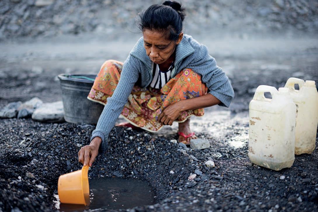 Goncalves collects water from a hole she has dug out. She uses pebbles to filter the water in this hole. TimorLeste.