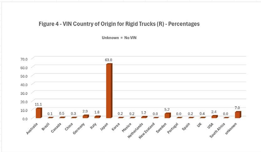 The rst three characters of the VIN identify the country where the VIN was issued and for full-volume suppliers, the manufacturer’s code. ARTSA-I uses this information to identify the make and the country of VIN origin. Having an Australian VIN does not necessarily mean full manufacture of the vehicle in Australia, but it does imply substantial local manufactured content. Figure 2 shows graphically the countries of VIN origin for the single trailer registration code SP*. About 41 per cent of these have an Austrralian VIN. The Australian VINs are mainly for Kenworth, Volvo, International IVECO and Mack. Figure 3 shows that for multi-combination prime movers the proportion with an Australian VIN is higher at 54 per cent. Australia has allowed multi-combination trucks to operate in major towns and cities. Allowing long trucks to operate in major towns and cities has increased productivity and reduced truck traf c compared to the single trailer scenario. It has also underpinned a signi cant prime mover truck manufacturing industry in Australia.