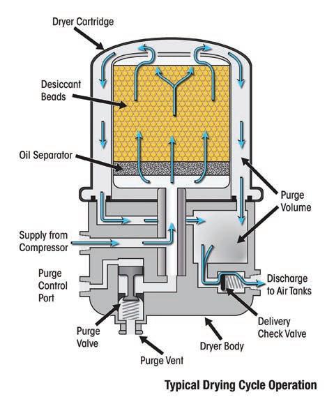 Dryers use a purge cycle to force air, in reverse, down past the beads and out the purge valve. When air pressure is applied to the purge control port it will open the purge valve, which releases air through the vent at the bottom of the dryer body.