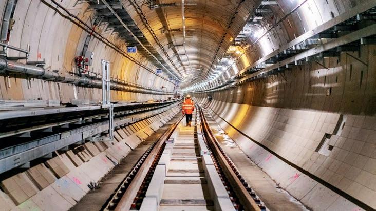The final tracks being laid represents the culmination of nine months of work along the twin nine-kilometre tunnels and stations. These works began in mid-2022 with crews installing 4000 high-performance concrete panels to create an even base for the rail. The panels were cast in 300 different shapes to match the curvature and elevation of the tunnels.