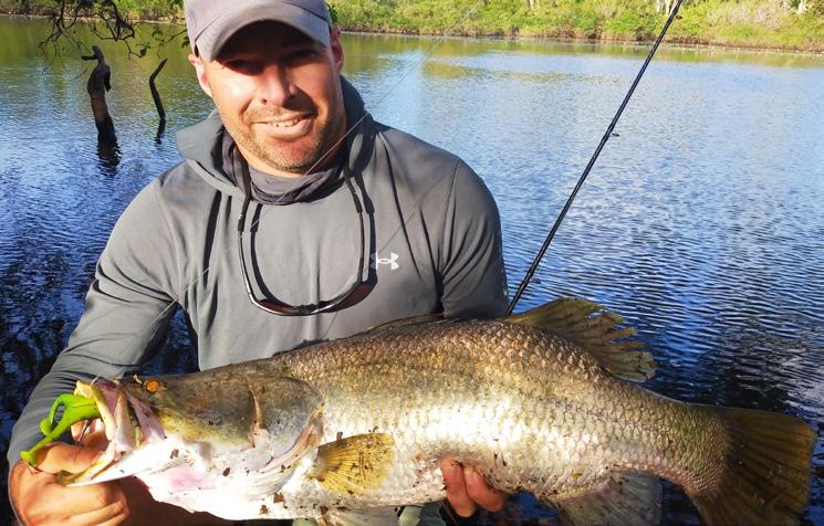 As I was about to cast long and wide, a brownish-yellow smudge materialised on the outside of a branch in the water below me. It was a big barra tail, the fish nose-down and out of sight. It took three casts, closer and closer, to make the barra stick its nose up and inspect my golden popper. One almighty surface boof saw me yank the popper out of its bucket mouth, almost falling from the tree and blowing my chance at all the fish in the process. Memories of missed opportunities stand out just as clearly as those that come up tight.