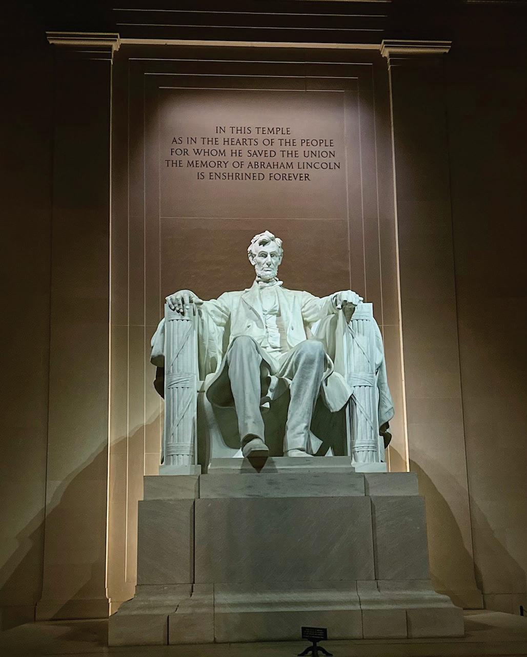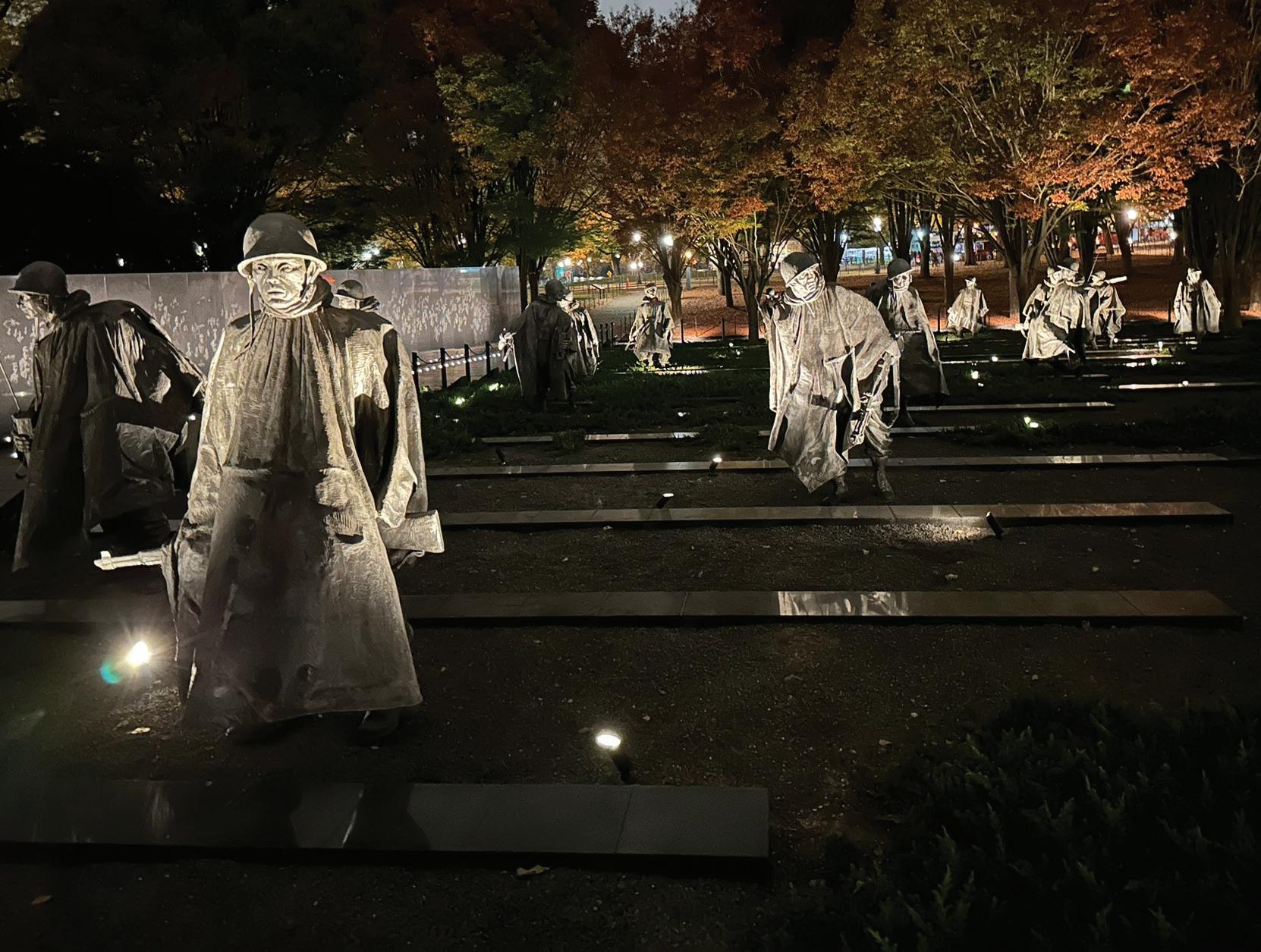 I visited with President Abraham Lincoln in hopes he could tell me how I can help to heal my country and my family. I then walked quietly into the darkness to the south of the Lincoln Memorial and stumbled upon the Korean War Veterans Memorial. It is in a grove of trees, and the soldiers are of di erent ethnicities and ages. As I looked at their faces, it appeared they each had private thoughts, goals, and beliefs.