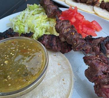Giving your menu a theme, like street food, helps set the tone for the party. Portable, flavorful and easy to prep in bulk, street foods such as tacos are perfect for large gatherings. Hawkins’ signature move is combining mini street foods think tacos, gyros or bao with skewers to create “bundle skewers.” These Bundle Skewer Street Tacos are an ideal example of a playful, practical solution for portioning and presentation.