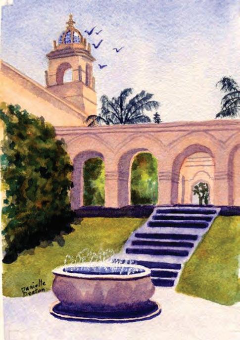 But her main passion of course is watercolor and she continues to be a part of the Spanish Village experience where she shares a studio with three other artists. Being in Balboa Park works out spectacularly for Danielle, as there are many, many Spanish-style buildings and fountains to use as subjects as well as a plethora of plants and trees. Danielle is definitely enjoying her retirement and well representing the arts of San Diego.