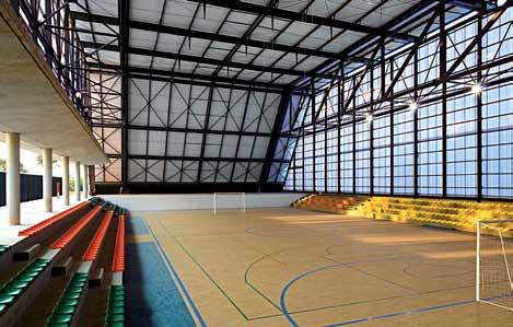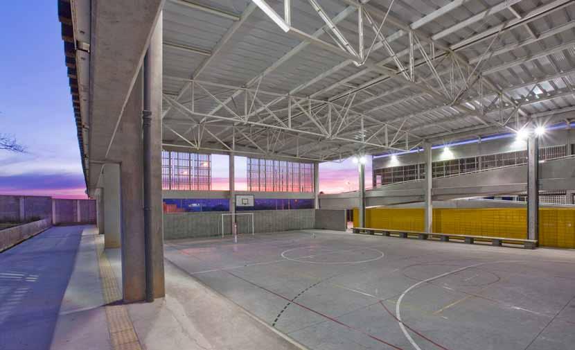 “Enquanto parte de um grupo de projetos desenvolvidos pela FDE, que queria experimentar um sistema industrializado de constru ção, optamos pela adoção de pilares pré-moldados de concreto e da estrutura em aço para os vãos maiores (21,60 m)”, afirma Puntoni. O aço também foi utilizado nas estruturas de fechamento e nas telhas metálicas da cobertura.