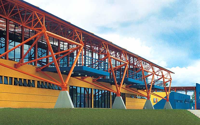 O emprego da estrutura em aço confere leveza ao edifício, destancando-se do conjunto. Esta configuração é ainda mais acentuada com o jogo de cores proposto, distinguindo sempre a estrutura dos outros ele mentos construtivos, nas fotos acima, à direita, e abaixo. Acima, à esquerda, cobertura metálica da quadra