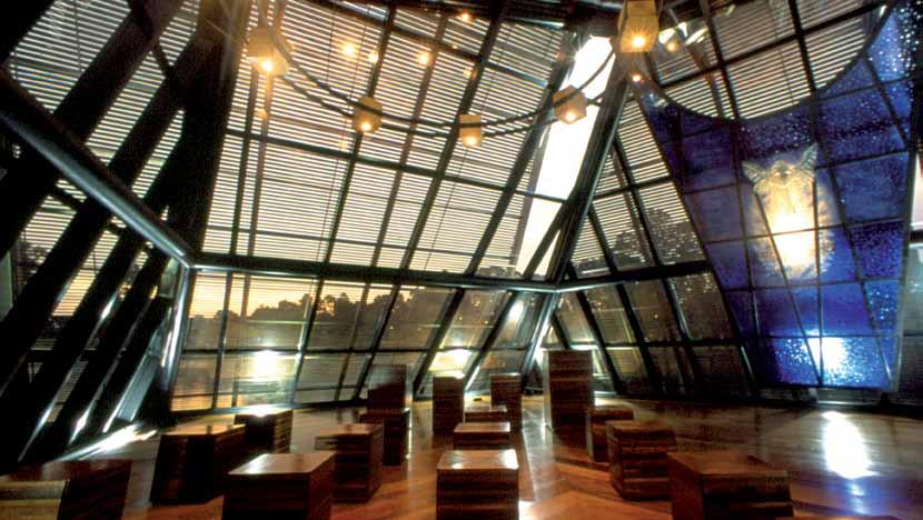 O arquiteto adotou uma estrutura em que as vigas de aço e as lajes estão solidarizadas, formando vigas mistas, enrijecendo desta forma todo o conjunto estrutural. Abaixo, praça e fonte que determinaram o partido arquitetônico