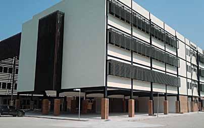 O setor acadêmico é composto por seis blocos didáticos idênticos, perso nalizados por meio de um sistema cro mático aplicado nas peças metálicas aparentes - brises, marquises dos aces sos e escadas de saída de emergência nos finais dos corredores -, para facili tar a identificação.