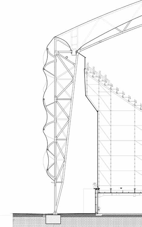 Na ilustração acima, corte da estrutura metá lica que suporta as arquibancadas e das diversas camadas que compõem a cobertura