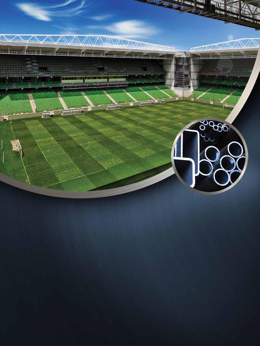 comprimento, 100 m de largura e 35 m de altura, totalizando 11,5 mil m2 de área bruta construída. Um dos maiores destaques do projeto é, sem dúvida, sua capacidade de desmontagem após os eventos esportivos. Tal característica é obtida graças à estrutura constituída por um pórtico de aço revestido por 20 mil m2 de painéis leves de PVC reci clado. Este revestimento translúcido