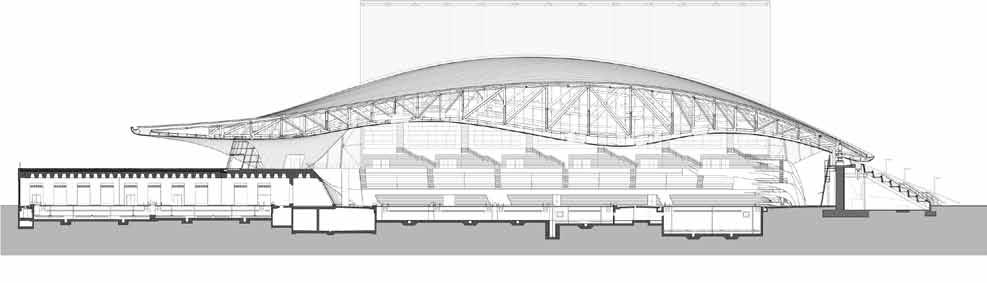de entrada para a arena e permite aos espectadores manter contato visual com a ação na pista, bem como a se mover ao redor da construção. Objeti vando conceitos de sustentabilidade, o formato da cobertura foi responsável por minimizar o volume construtivo e garantir, por exemplo, iluminação e adequação térmica do ambiente. Nele, uma malha de cabos de aço foi utiliza da para cobrir totalmente a sua exten são – sistema semelhante a uma raque te de tênis. Os sistemas baseados em cabos trabalham tracionados, e, neste caso, a tração atua sobre um anel de compressão no perímetro da cobertura.