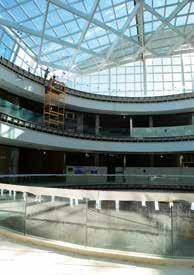 tivo era que a fachada (20 m de altura por 44 m de extensão), que está inserida no acesso principal ao shopping, fosse necessaria mente a mais esbelta possível com o propósito de manter um visual leve e transparente. Para isso, foram desenvolvidas ligações especiais, bem como utilizados tirantes de aço associados a vigas de vidro.