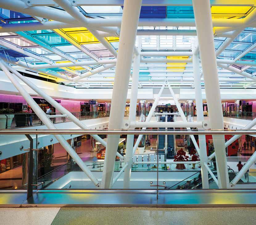 Francisco Bacelar destaca, ainda, a sustentabilidade como marca do projeto. “O recurso de usar domus de vidro auxilia na redução de consumo de energia, tendo em vista que, ao longo do dia, toda a iluminação natural é aproveitada.” A ideia, segundo ele, foi oferecer ao mercado um centro comercial moderno, com corredores amplos, bem iluminados e equipados de bons serviços. “Atualmente, o desa fio é executar projetos que causem menos impacto ao meio ambien te, tanto do ponto de vista construtivo quanto operacional, sem deixar de lado, é claro, o bem-estar do consumidor”, finaliza. (C.E.) M