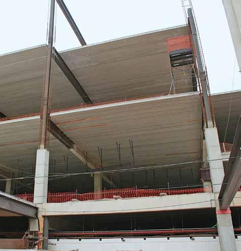 Na área do Shopping, com cobertu ras e fechamentos em estrutura metá lica, a estrutura de piso é de concreto pré-moldado. No edifício de garagem foi utilizado um sistema misto de aço e con creto para as vigas e lajes, com steel deck como forma e armadura positiva das lajes executadas com pilares pré-molda dos. Segundo Falcão, o uso de estrutura metálica para o deck park proporcionou velocidade na execução da obra, além de redução nas cargas de fundação.