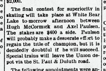 to skate at full speed on a 7 ½ lap track unless it is properly lighted.” When asked if he would win the second race, Paulsen responded: I am going to skate pretty hard and hope to be quite well by that time. I am considerably handicapped. In the first place the race takes place in the evening when it is very difficult for me to skate fast, as I am very nearsighted, which makes it hard for me to distinguish things with certainty. In the second place, as I have said before, the rink is too small for me but is just suited to McCormick. The majority of Canadian rinks are small, some even requiring 17 laps to the mile. To these rinks I, on the other hand, have made my best time on rinks of three or four laps or else straightway. Continually turning corners requires a different motion and also a special training… If I lose Wednesday's race I propose to have something to say about the place of skating the last race. I have agreed to McCormick's terms twice, giving him the advantage. In all probability, I shall decide on Eau Claire as the place of the last race. I shall also insist on McCormick and myself starting at different points. I hope then to