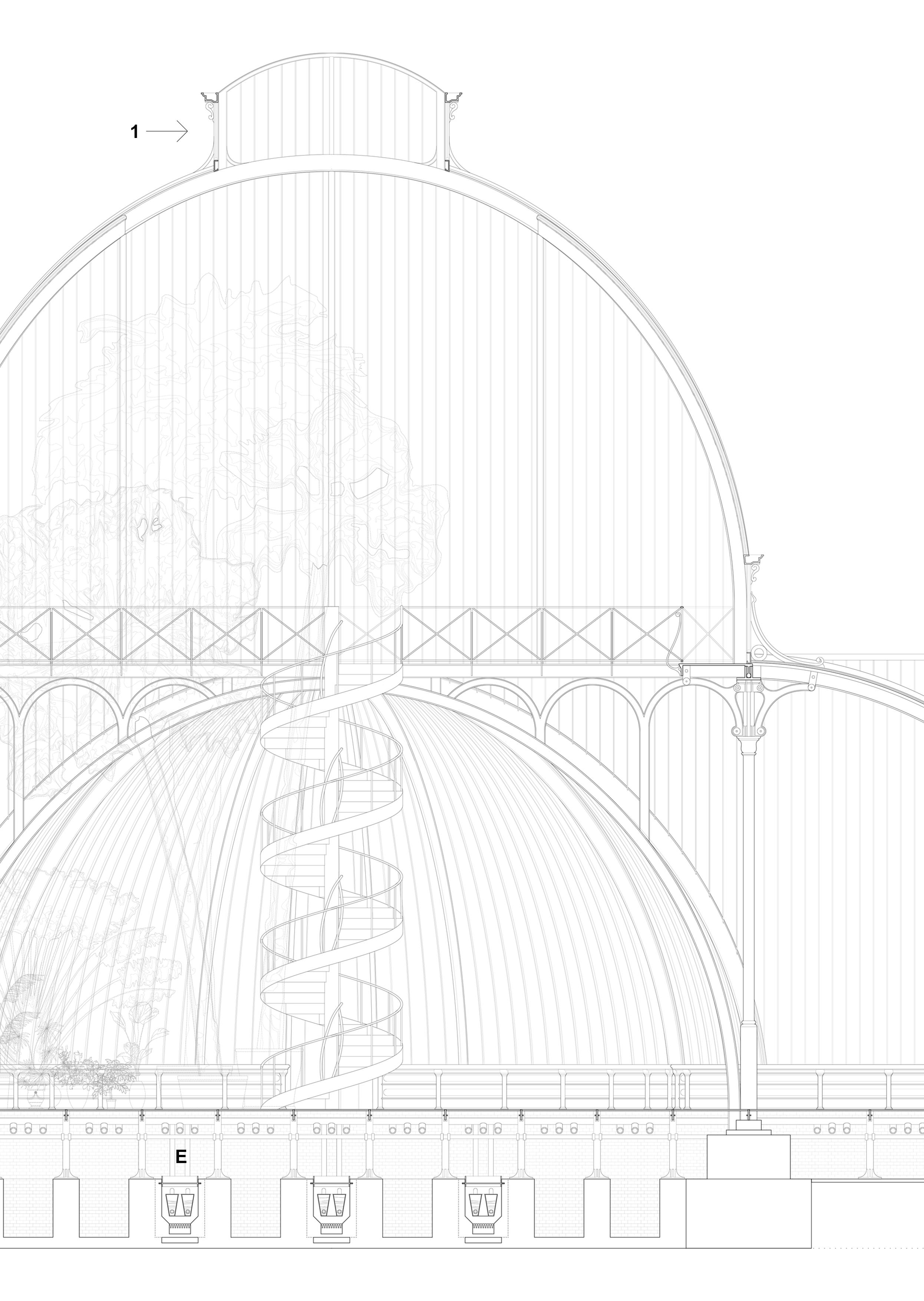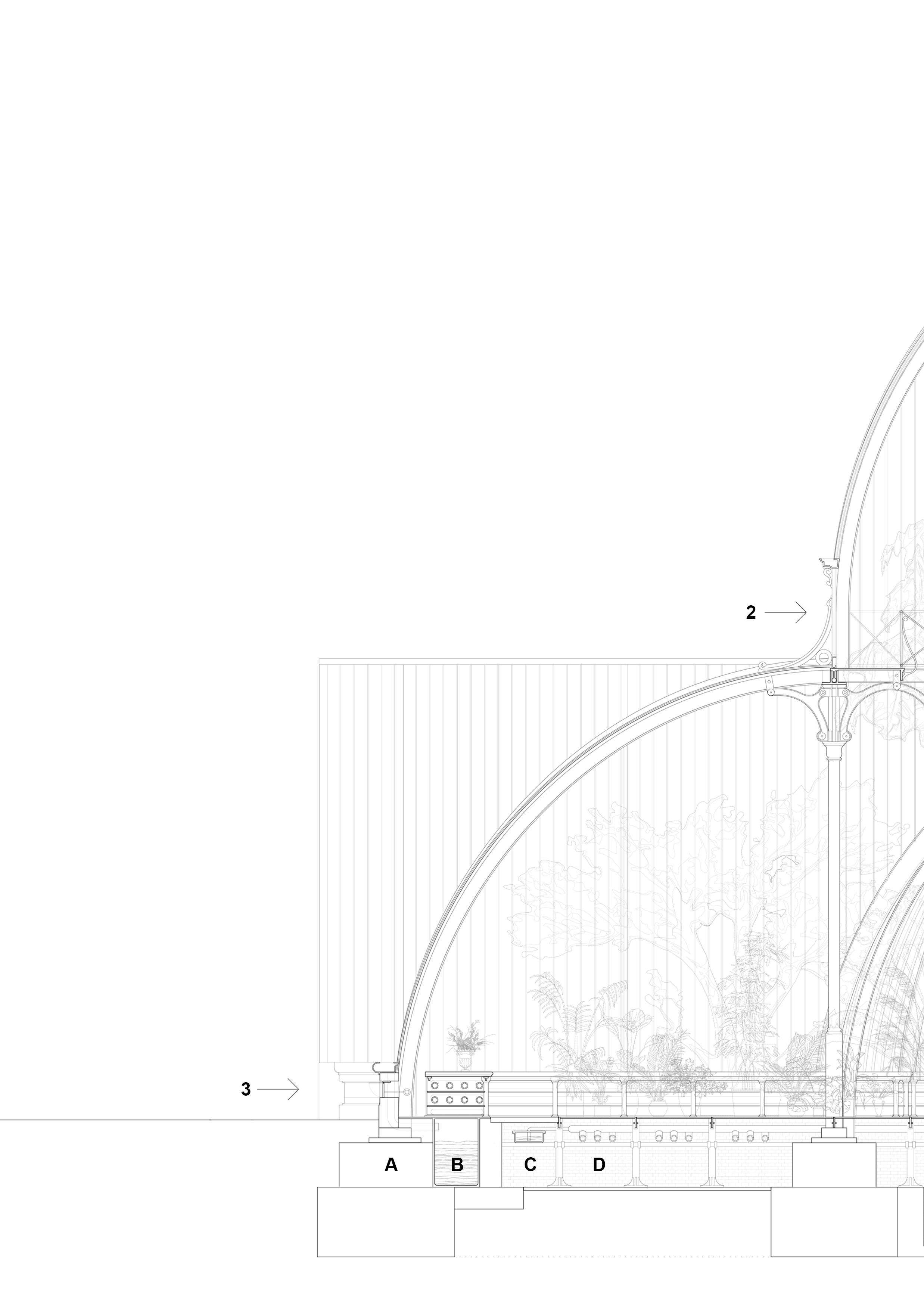 Plam House's geographical layout and form echoes the above discourses, and rendering itself as the elucidator of comfort. The placement of the Palm House at Kew appears to be in response to the prominence of gardens as a public institution and the desire to present buildings and collections from a suitable vantage point. It appears to respond more to aesthetic than scientific purposes. Being glazed on all sides, such buildings lacked the masonry wall that would have formed a northern ‘back’ to the forcing-house, which serves to absorb the sun’s heat. Given the improvements in heating systems, the provision of this wall was 15