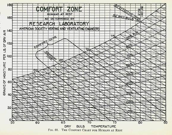 ASHRAE, which was first issued in 1966, defined today’s global temperature standards and constituted a design norm for large public buildings, including shopping malls and production buildings such as offices and factories. The goal is not only to provide engineers with quantitative certainty in the rugged debate before the general public and regulatory agencies in particular but also to make comfort a globally marketable commodity. ‘Adaptability’9 and its instrumental adaptation zones respect the world’s climates and cultures, as well as their different lifestyles. In the UK, the institutional history of the Chartered Institute of Building Services Engineers (CIBSE) is portrayed as a ‘quest for comfort’.10 The entire process is accompanied by a preoccupation with what constitutes a healthy, comfortable climate. They questioned whether a spring morning in the cool mountain air or a summer day at the seaside – often used for commercial promotion by air conditioning manufacturers – should be emulated, and opted for laboratory studies of the human body, providing a benchmark for the scientific specification of comfort. Moreover, in the same move, they established the need for mechanical heating and cooling around the world, which combined with its representation in architectural standards and mass media has monopolised our perception of the built thermal environment. Consequently, its presence is still strongly felt to this day. Since ancient times, a cold place could be used as a space to sleep and a hot place for extended sitting; now, this equates to 12°C for a bedroom and 18°C for a living room.