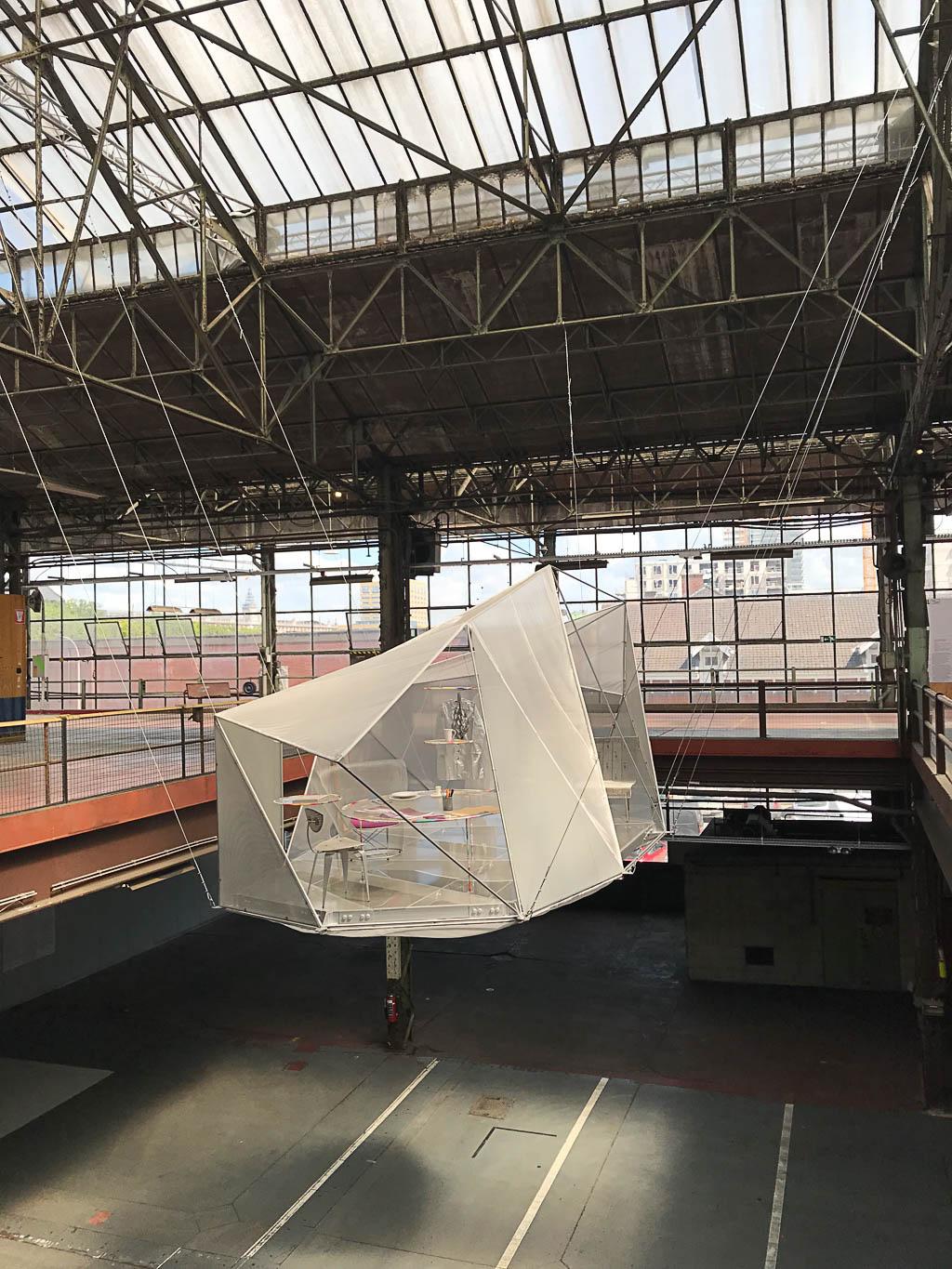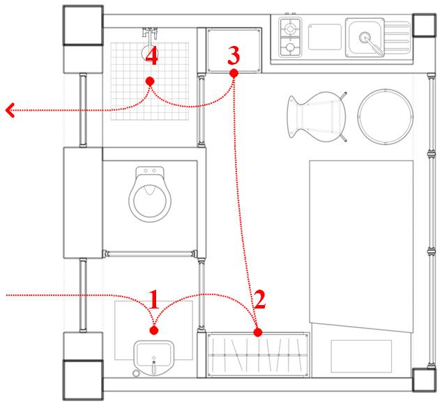 themselves to a shared temperature-functional code. The freshwater pipes in the room can be connected to the faucet, increasing the space’s flexibility by allowing it to be functional when needed. All the objects are either light enough to be moved with one hand or are placed on wheels that can be locked when necessary. The sliding door’s facade allows it to be completely opened during the summer while encapsulating the climate inside during the winter. The air tube formed by the position of the opening is regarded as a self-managed environmental control technique. Moreover, the abstract white grid covers the communal floor heating hidden beneath the floor slab. Furthermore, the Self is represented through the three-dimensional arrangement of the objects.