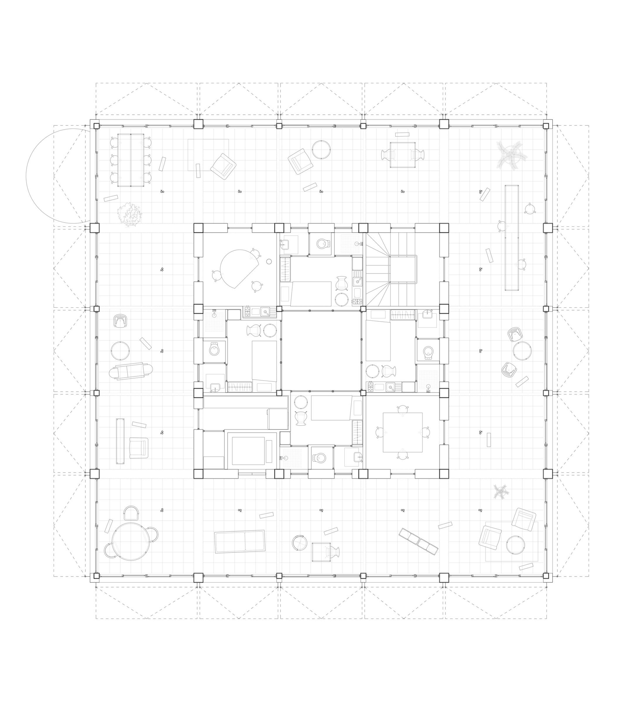 ‘Moderator’, the last design proposition is a slab-type dwelling constructed on a four-by-four column grid. The outermost columns are exposed on the façade.