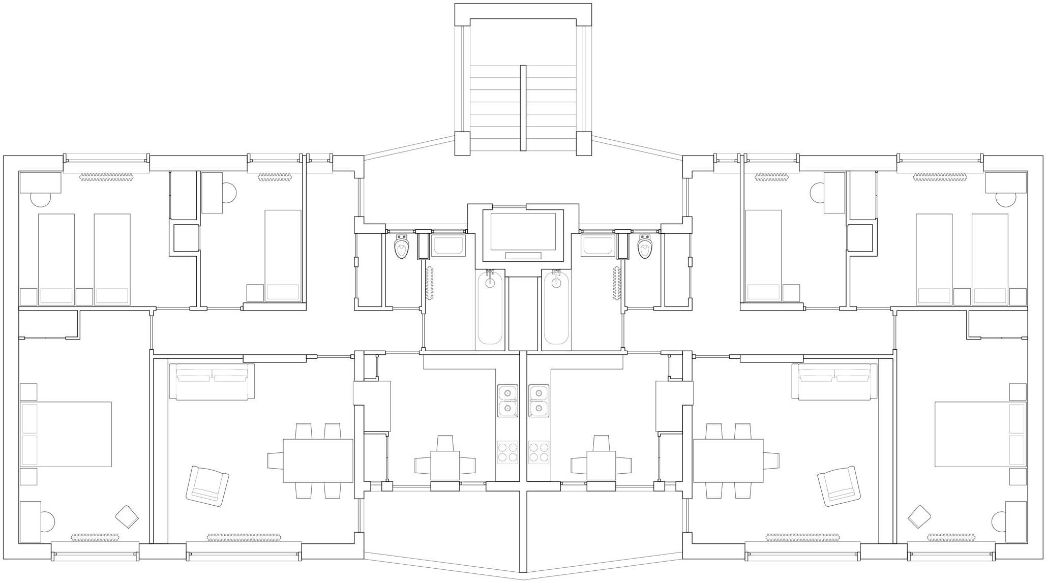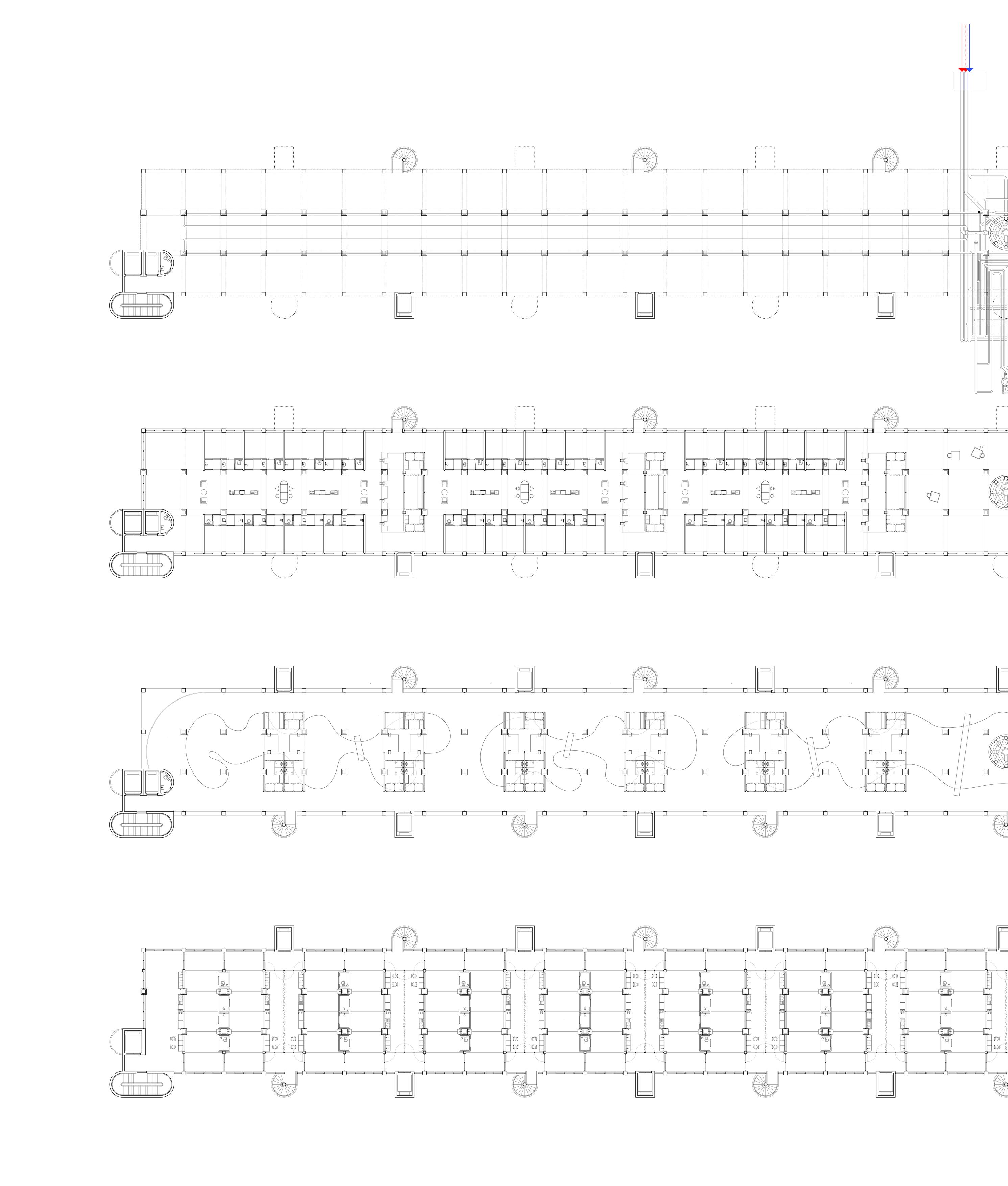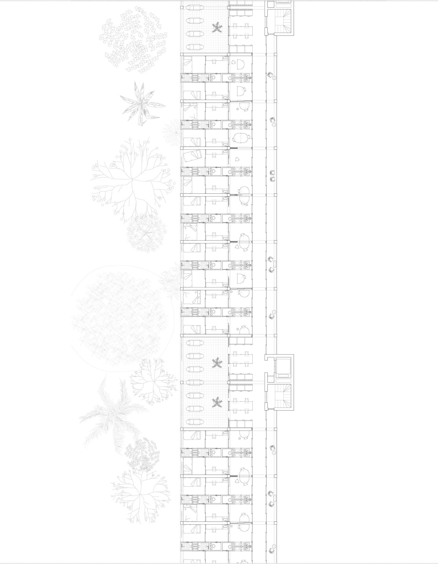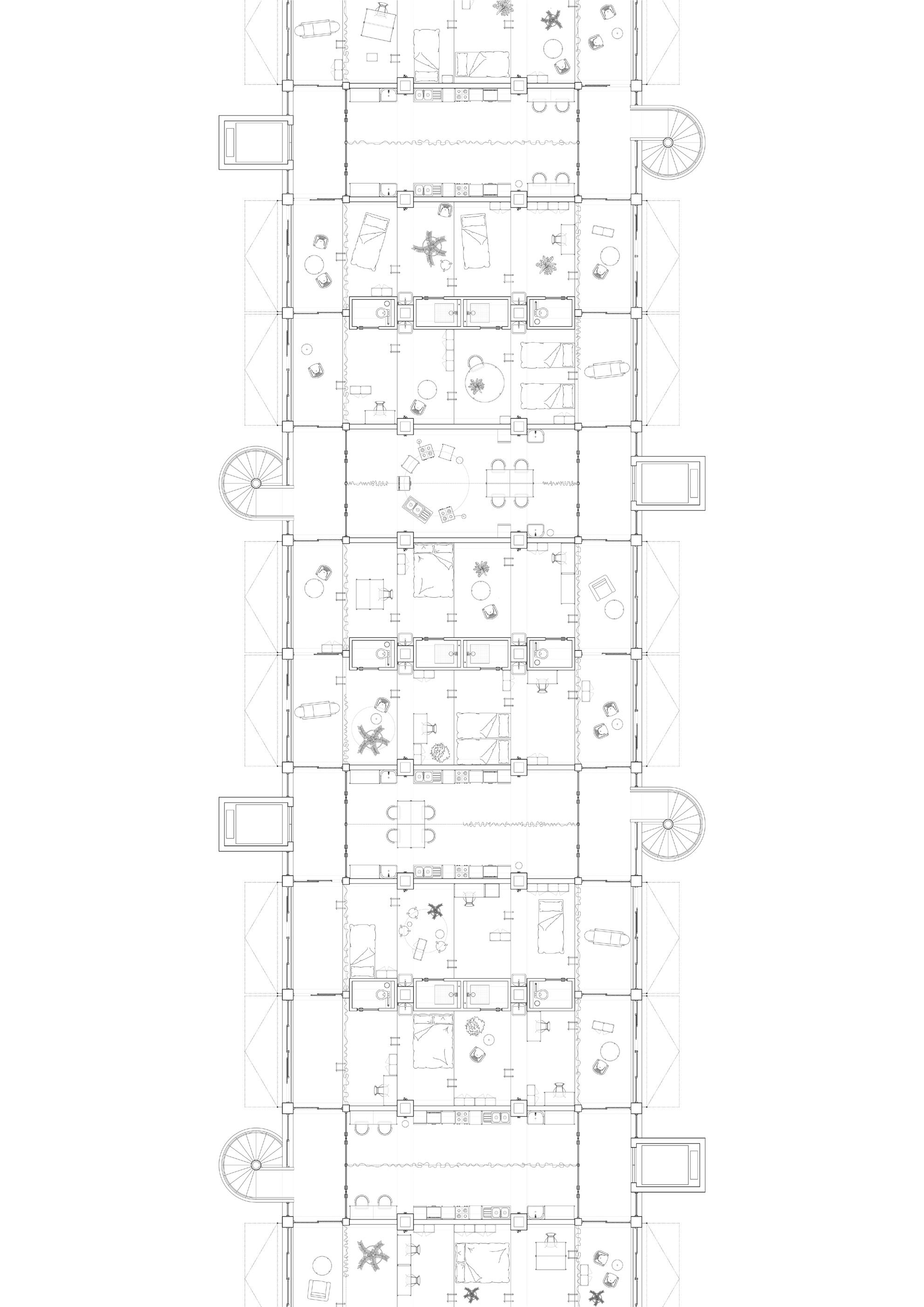 The building’s programme is divided into four spatial figures. From top to bottom, level 1 hosts the heating infrastructures before the residential floor’s entrance, while level 2 offers 16-sqm living cells and central communal space. Climatotherapy is placed in-between the Upper floor, level4 of 42 sqm apartment, and the lower floor of the living cell across the passage that one must go through before reaching the upper levels.