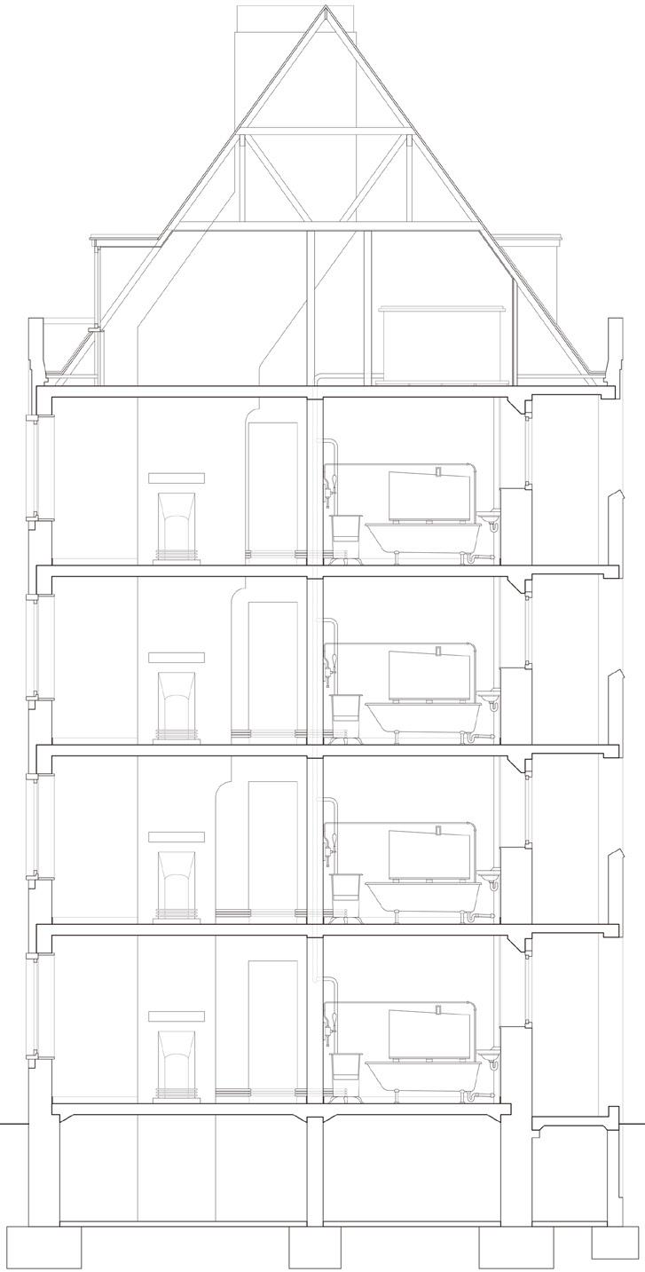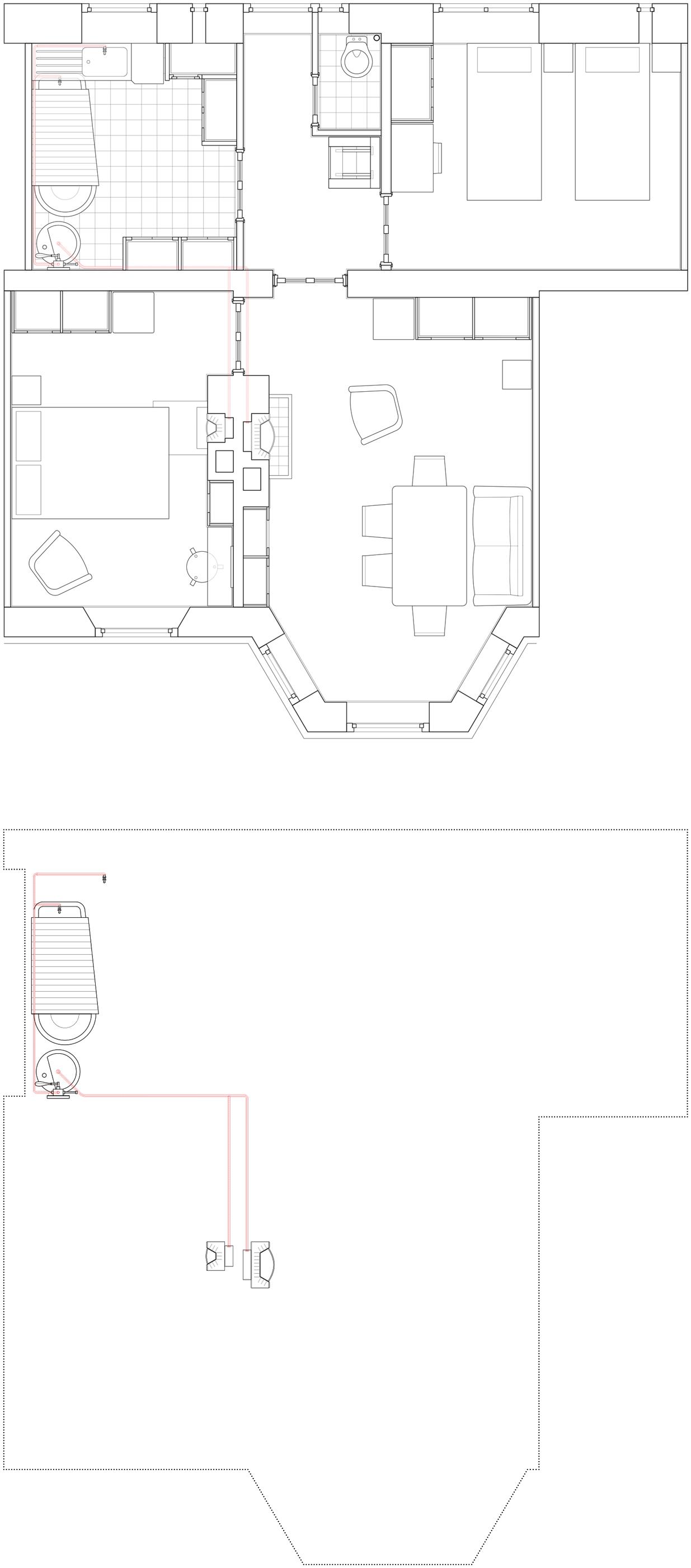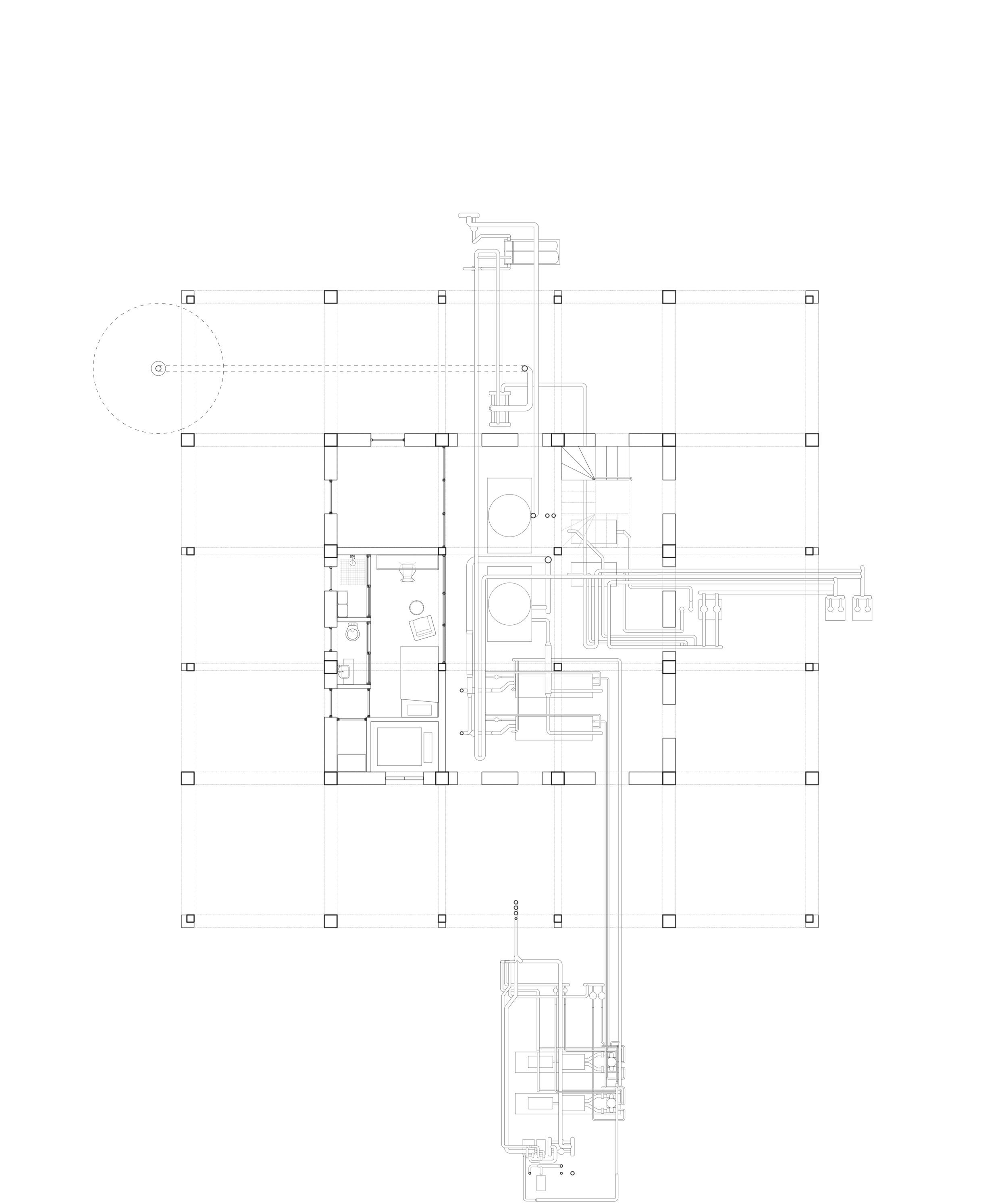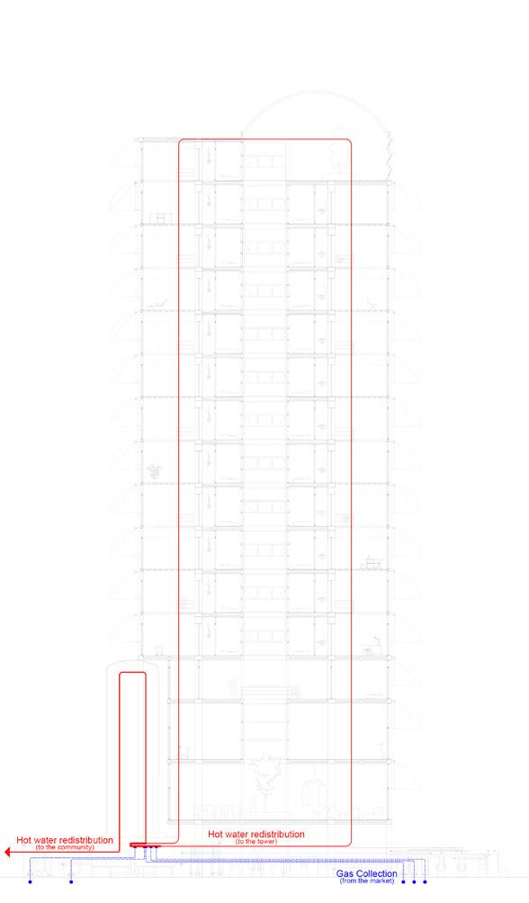By incorporating the design principles of a ‘connector’, the infrastructure arranged on the ground floor of the building suggests a collective distribution and consumption of energy. They are connected to a hot water storage tank in the building’s