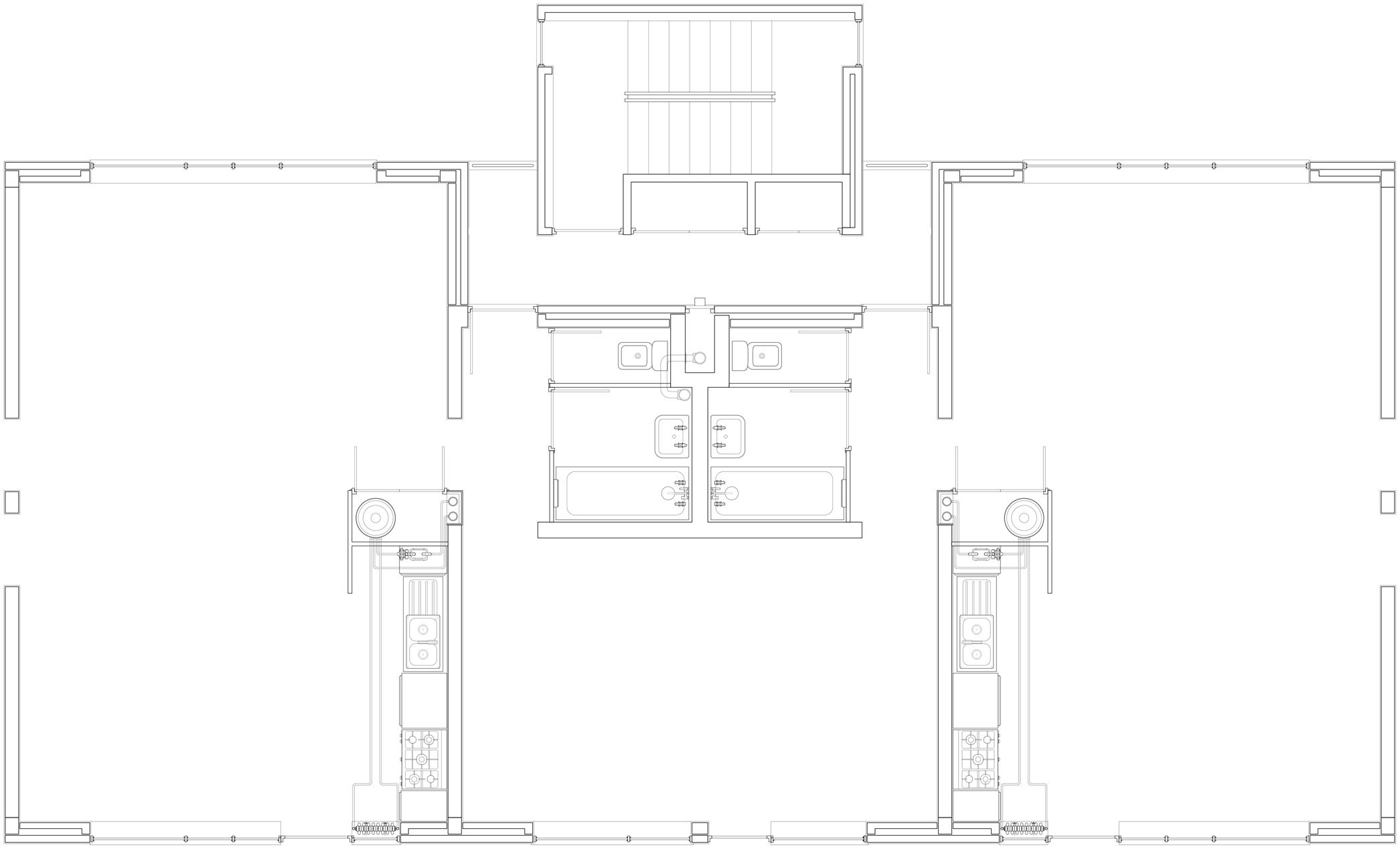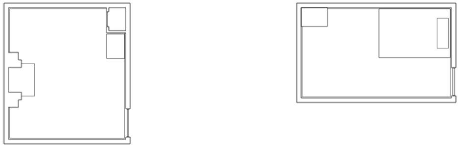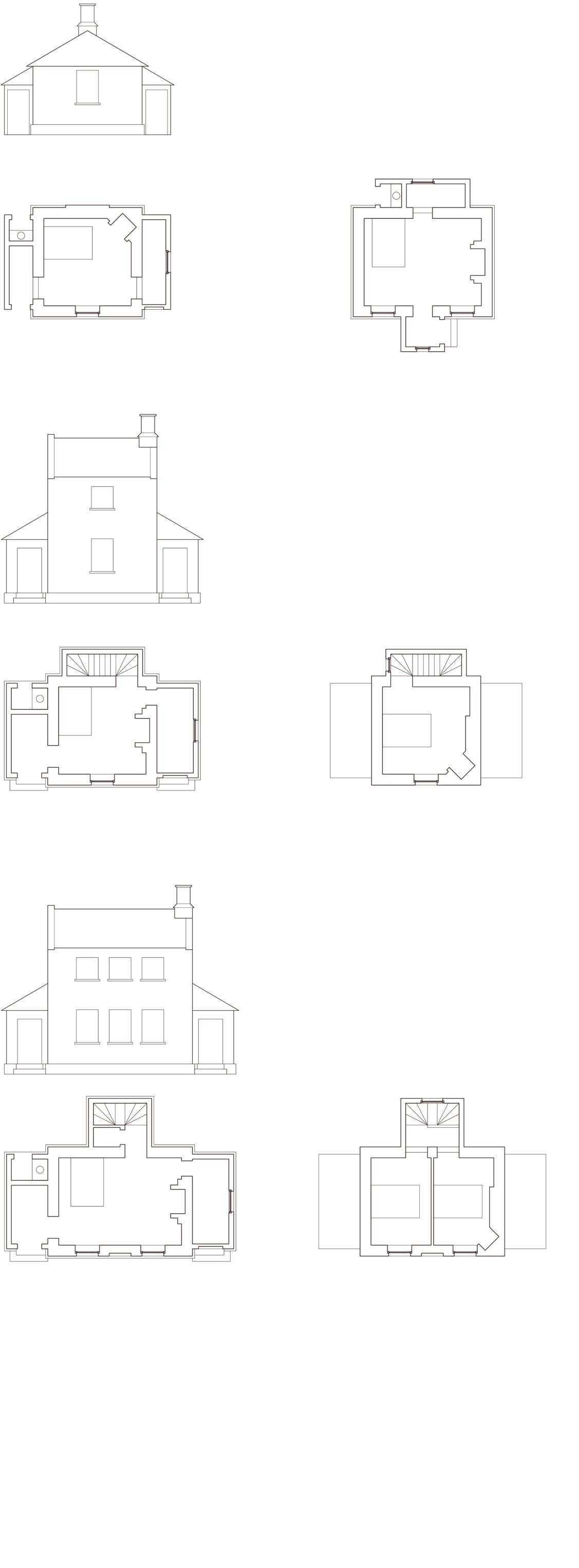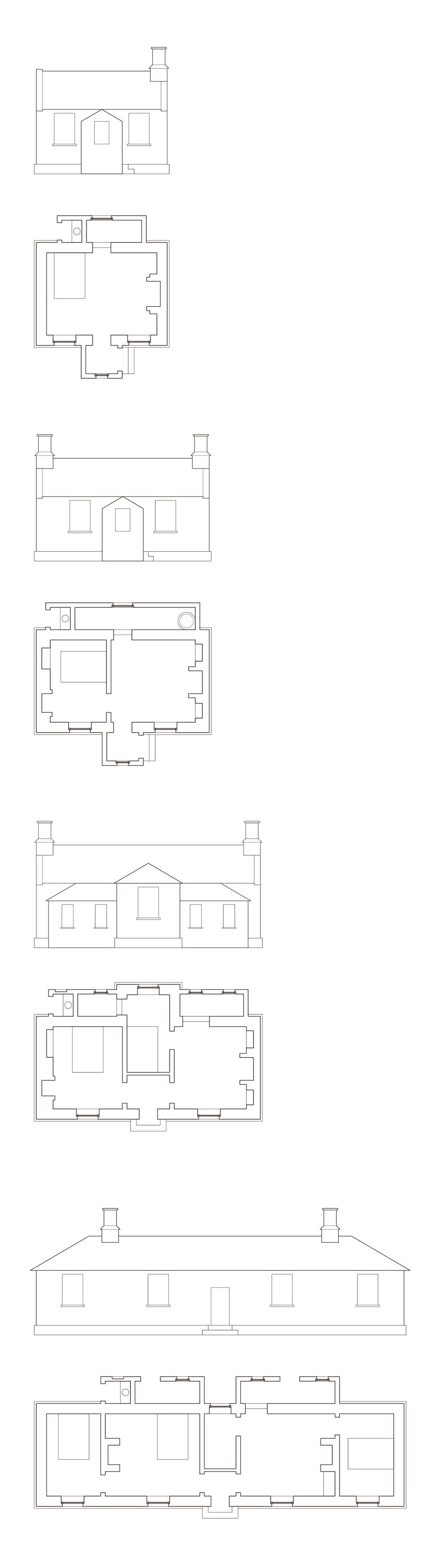 The composition of each cottage – the arrangement and articulation of the plan and elevation (including windows, doors and the chimney) – was carefully controlled by a proportional system that was fixed according to established scales as a response to neoclassical principles. The bed, as the only guest object that could be arranged in the room, was positioned in the corner of the room, thus avoiding the footprint of the ventilation in the intersection between the chimney fireplace and the windows and doors.
