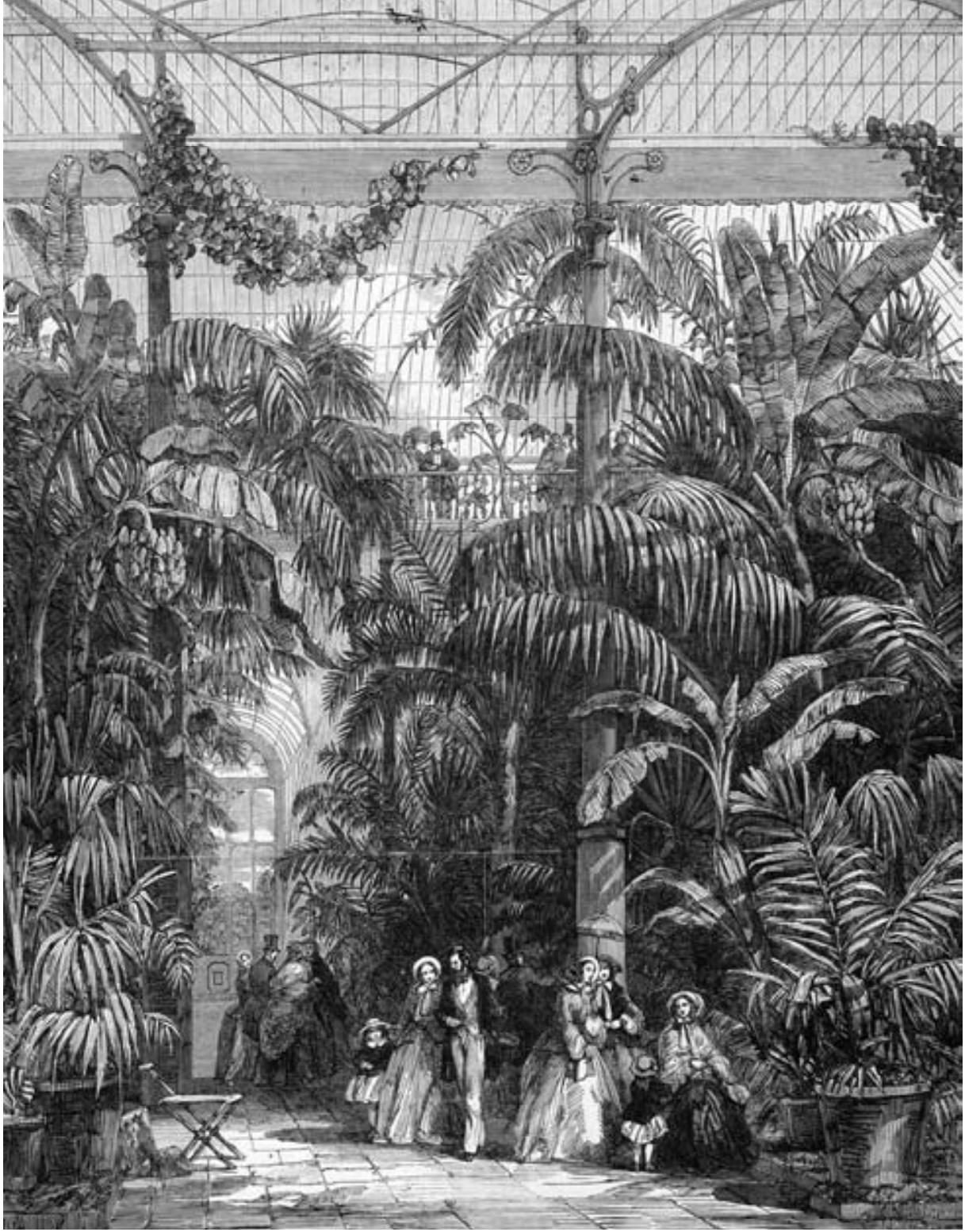 Ultimately, the ability of artificial climates to facilitate encounters between Victorians and the tropics acquired new authority through a series of large, public glasshouses that employed complex, mechanically-aided climate control systems. But within these buildings, the torrid zone was both literally and metaphorically present. Joseph Paxton’s Crystal Palace of 1851, for example, contained exhibits of African goods and people, while fountains and vegetation placed along the building’s transept – nicknamed the Equator – evoked tropical geographies.