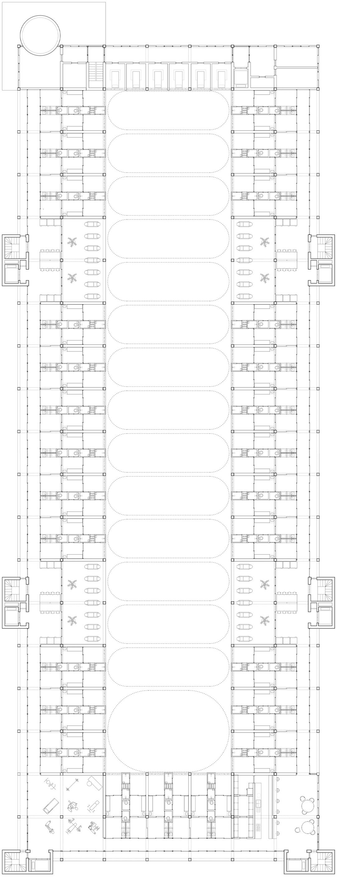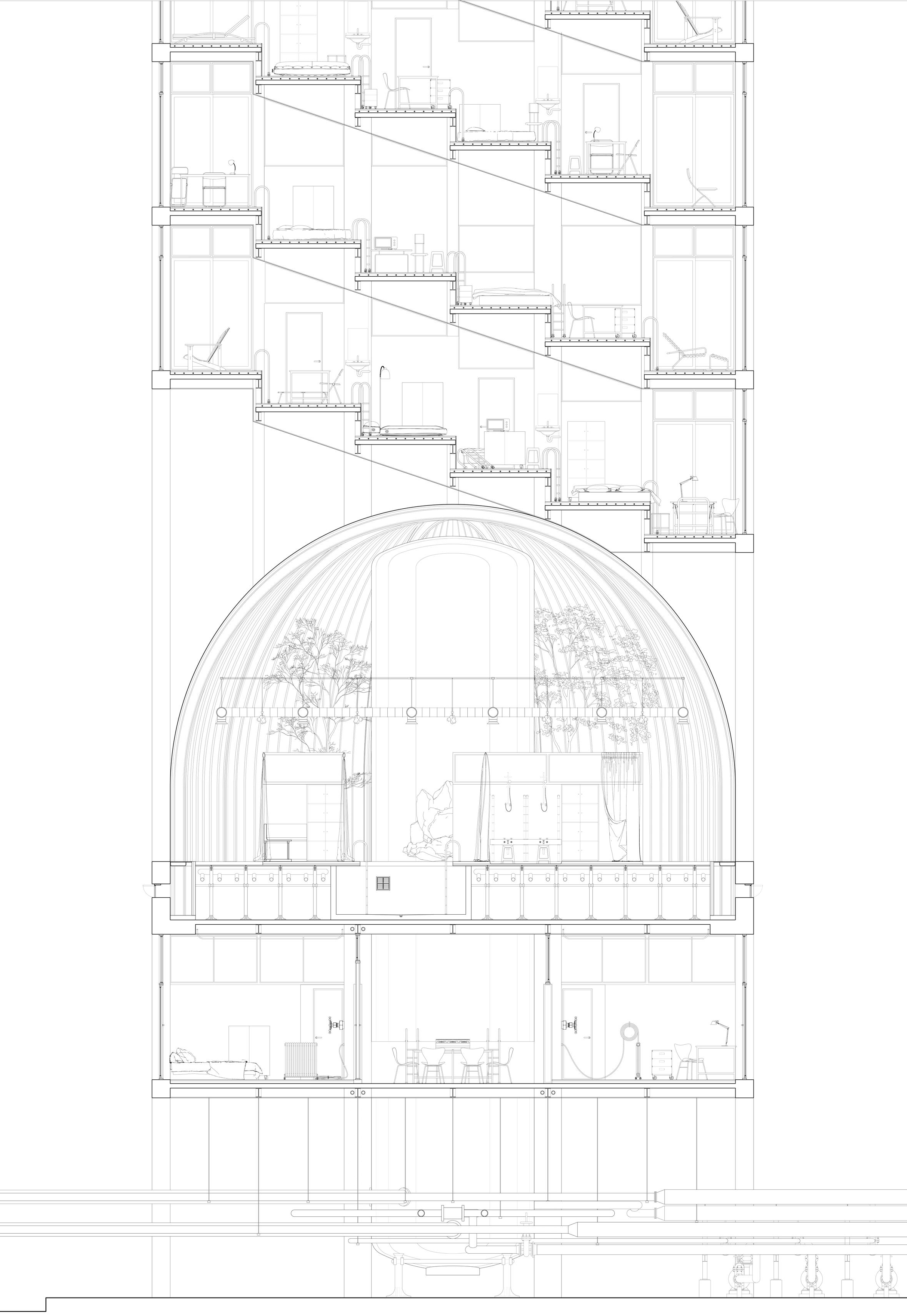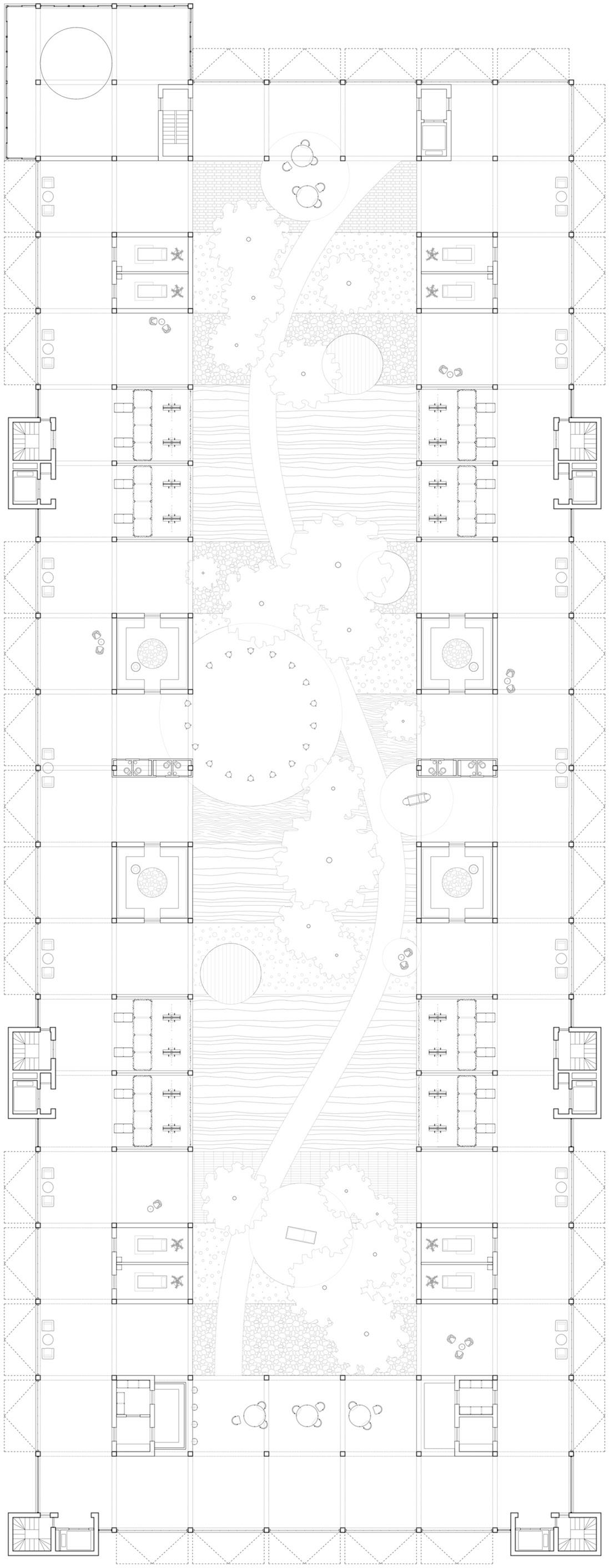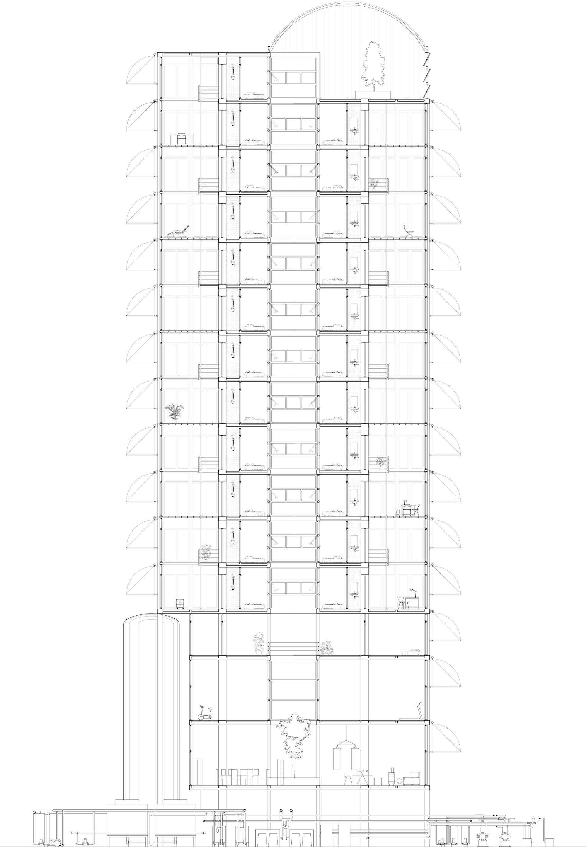 centre. Residents will pass by it before accessing the upper floors via open-air stairs or elevators. The public space surrounding the storage tank extends to the middle mezzanine.