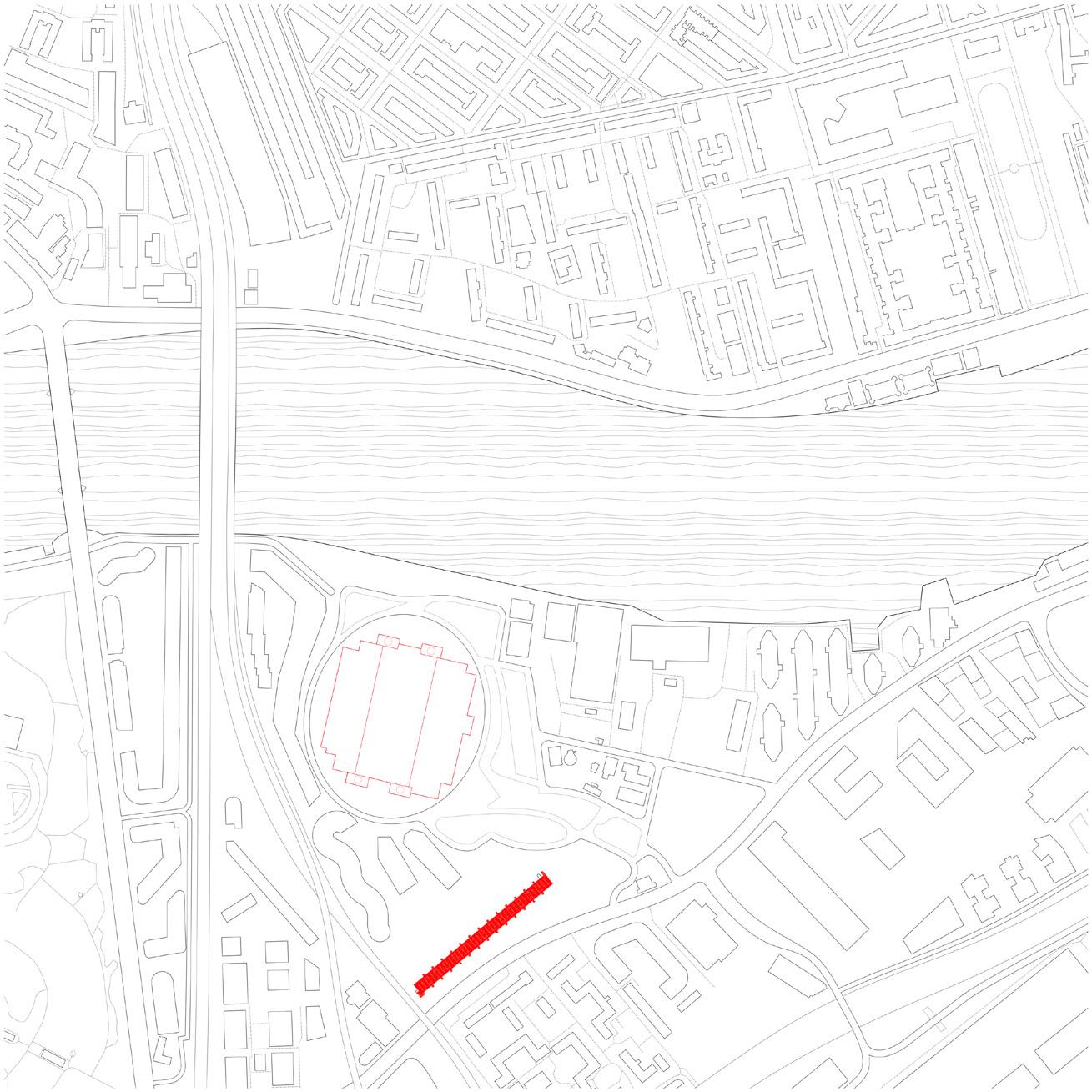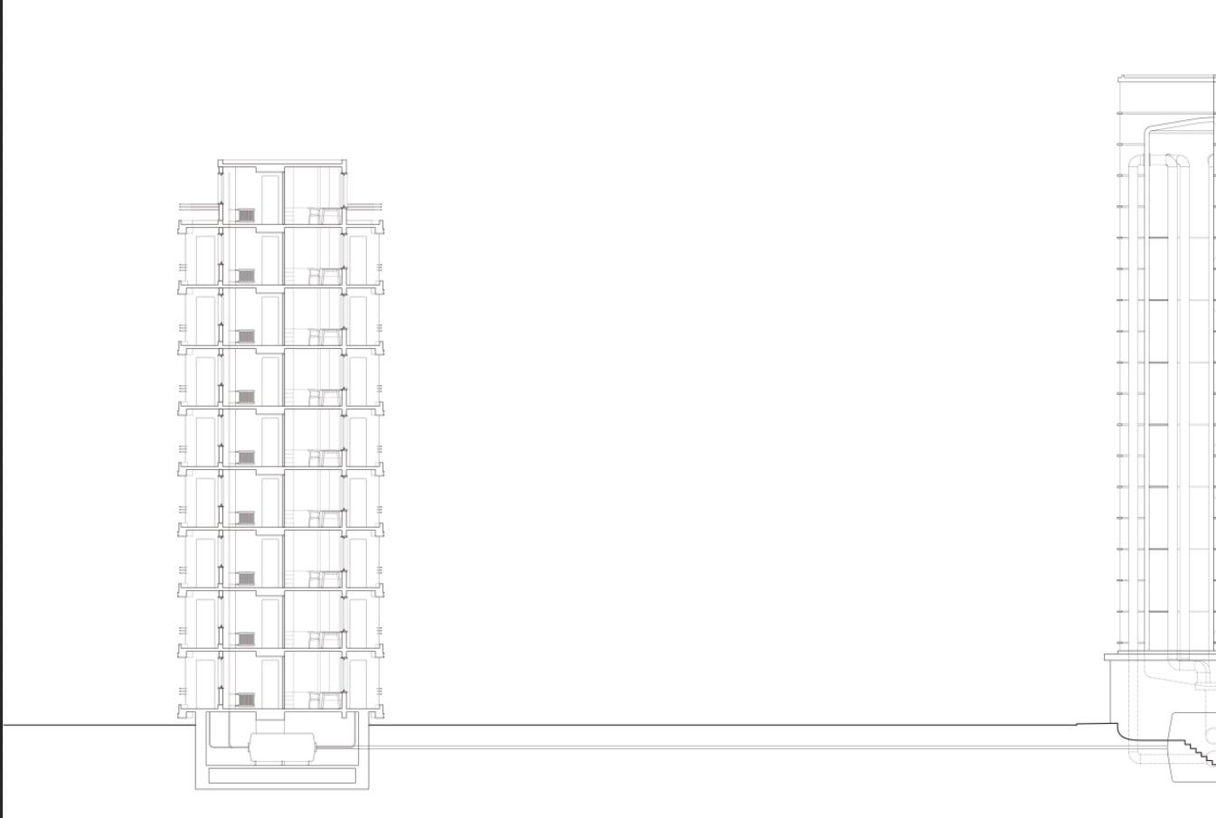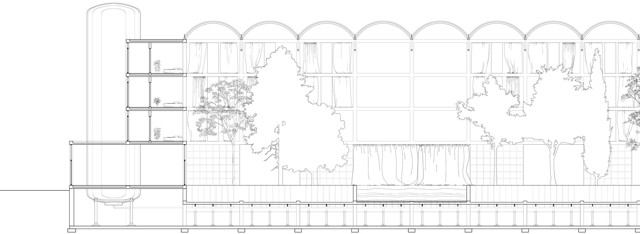 centre. Residents will pass by it before accessing the upper floors via open-air stairs or elevators. The public space surrounding the storage tank extends to the middle mezzanine.
