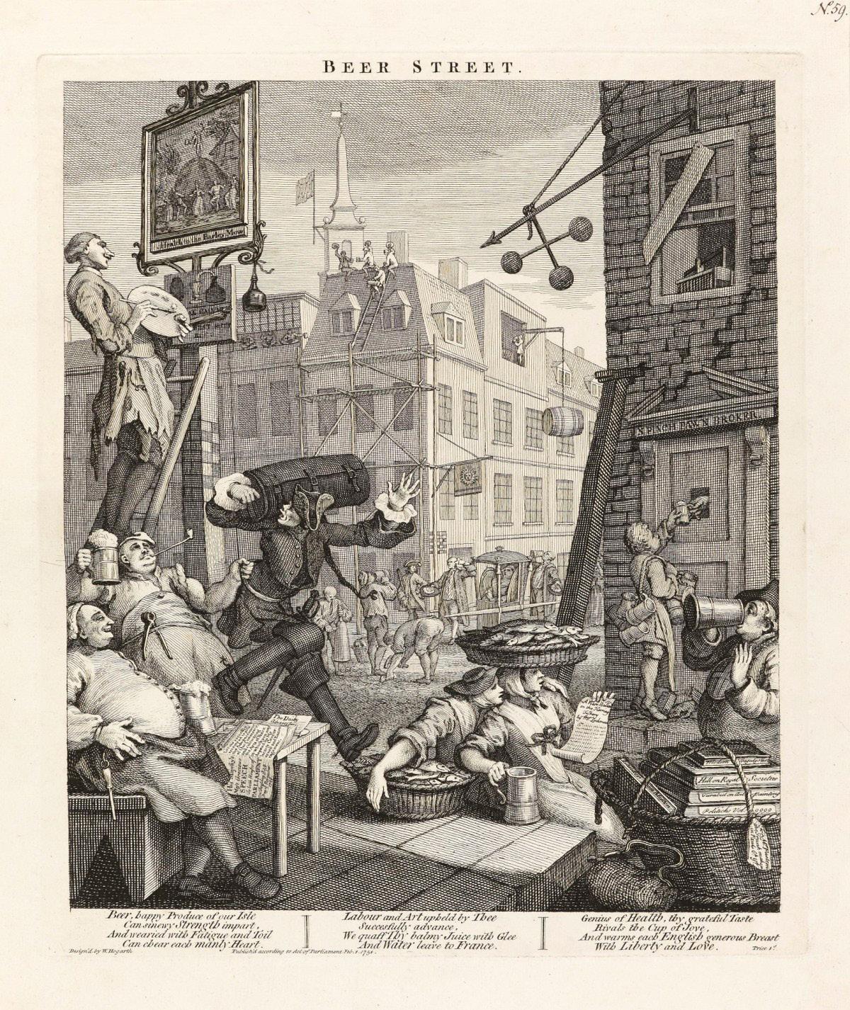 FIG.05 Prosperity. On Beer Street, trades and consumption thrived together: meat, drink, fish, clothing,shoes, books, even art. William Hogarth, Beer Street and Gin Lane, 1751