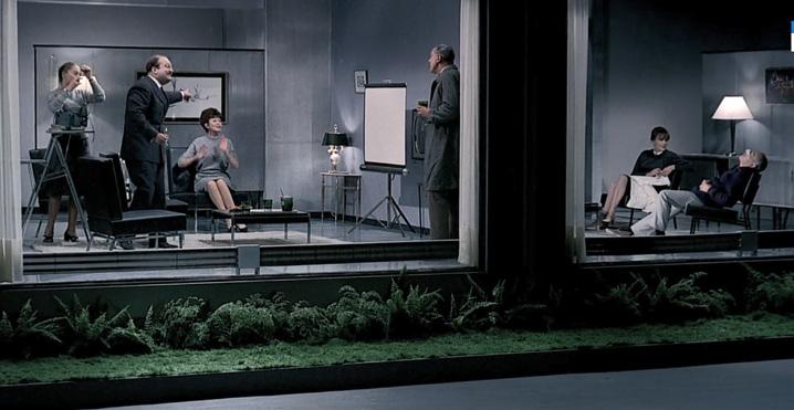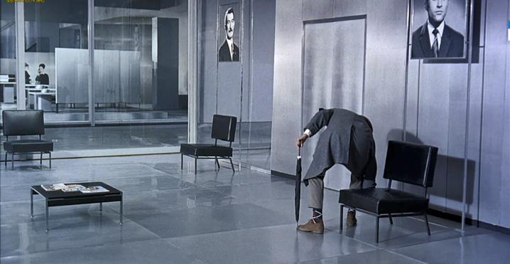 In the first scene, M. Hulot enters the company waiting room, where everything in the empty space is arranged in a way that seems to make him feel uncomfortable. He looks around curiously, then either steps on the floor to feel its hardness or squeezes his hands on the unfamiliar material. He finally sits on a leather chair fixed to the floor and tries to change its position but fails to do so. The camera switches to the outside of an apartment and a hotel. Behind the giant glass of these comfortable architectural types is the desire to show who they are. The camera allows us to identify the subtle differences in the ‘show windows’ by switching frequently. The difference exists in the arrangement of the furniture, the wine bottles and the paints, which respond to functionality in general that make a room a living room, a comfortable room.