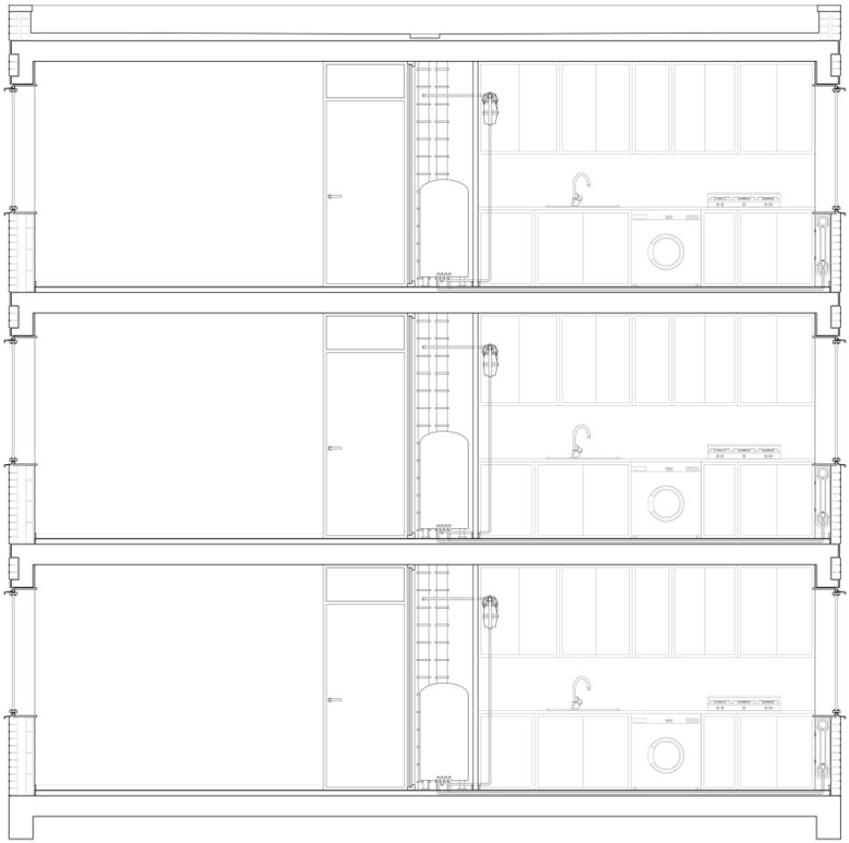 The floor accommodates 16-sqm living cells, which are framed by a sandwich layout with communal space in the centre and living cells on the outer side. The communal space is designed to take most of the dweller’s time by exposing a unit’s toilet, washing and bathroom on the inner side, organising formal cooperation in association with other domestic appliances. The multi-flexible layout of different arrangements is aided by movable radiators attached to vertical hot water tubes, which provide constant warmth during cold days. The lifestyle associated with the room’s thermal delight can be viewed on the inner side via the transparent corrugated board, which not only challenged the notion of privacy but also illuminated the communal space in the centre. Sun visors can store heat from the outer side of a room. The spaces in front of the vertical transportation points offer communal bath and sauna facilities.