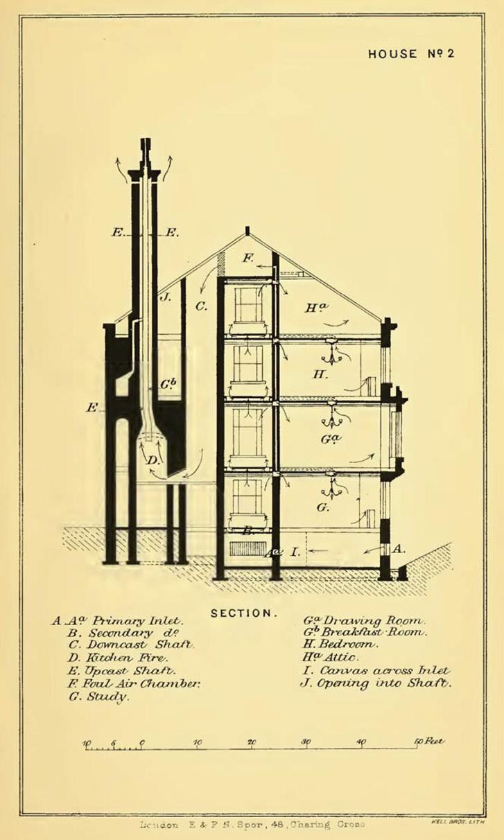 Although the chimney fireplace was originally introduced in England as something fashionable during the Renaissance, the acknowledgement of its health value grew rapidly in parallel with the great leaps forward that were being made in the medical, physical and chemical knowledge presented in innumerable home economics manuals in the late nineteenth century, which recommended that every room should have an open fireplace to ensure the health and comfort of its occupants. Therefore, the introduction of the chimney fireplace came to be understood as a health protocol for moral construction; this is further emphasised by the architectural form.