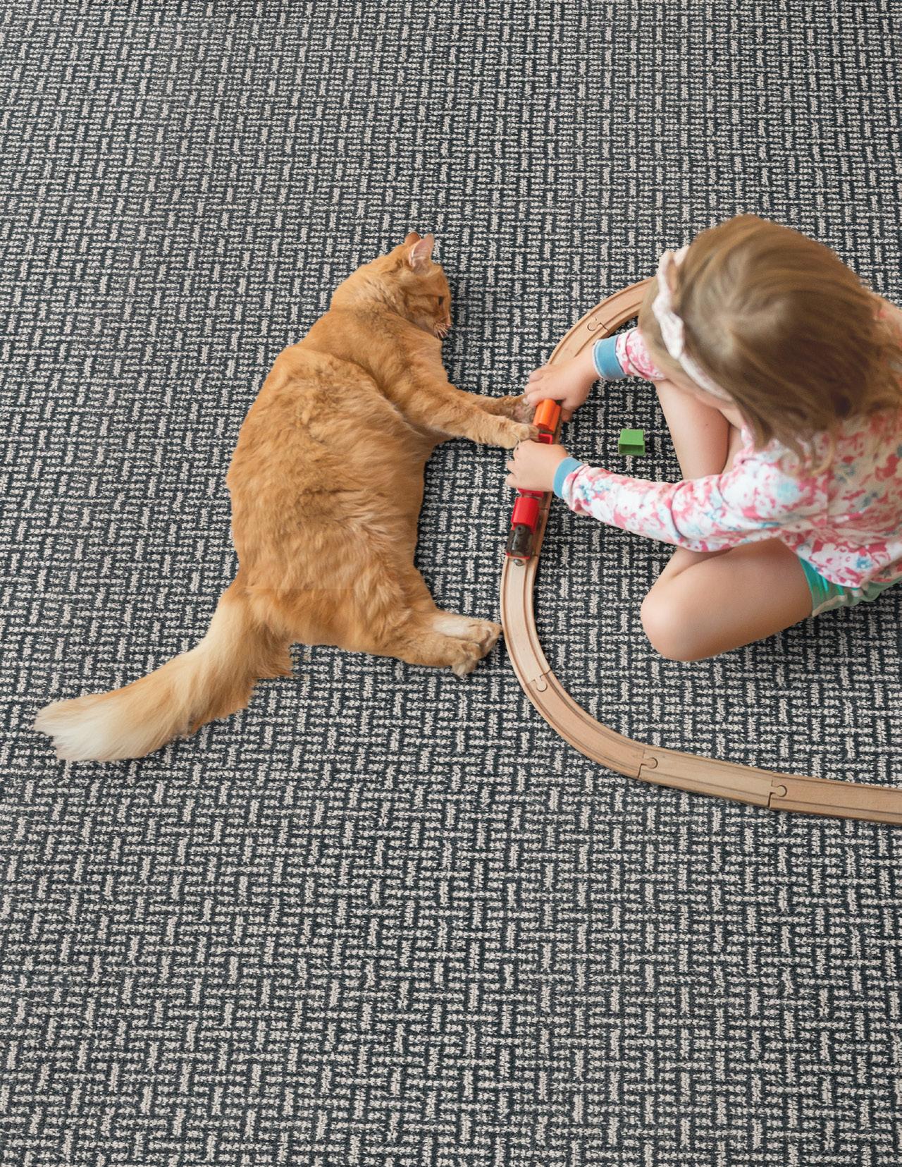 Performance Pet • 13’ 2” Width • 100% Solution Dyed Polyester • Machine Tufted Solid loop pattern with linear effect. Machine tufted construction adds durability and precision.