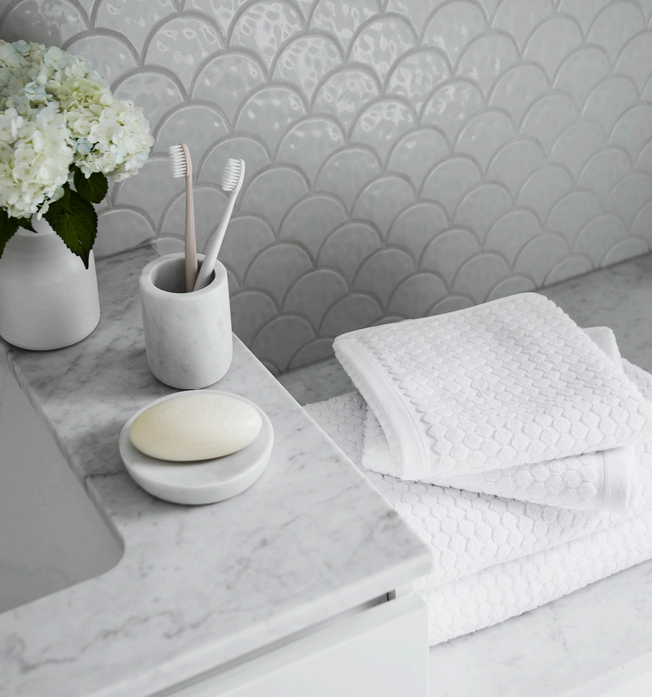 A few opulent touches in the bathroom will help create a luxurious retreat. You can never go wrong with fluffy white towels and marble accessories, they’re an instant lift for any bathroom.