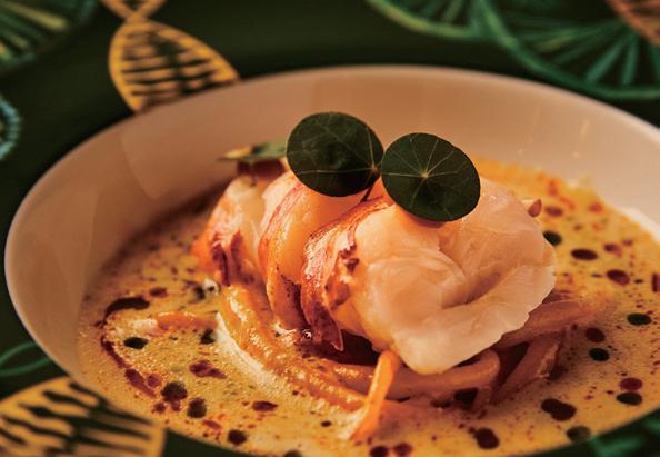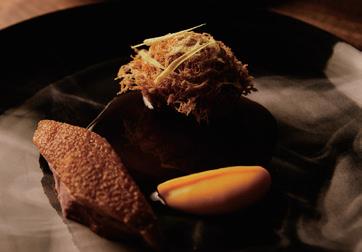 「Anatomy of a Fish」則完美詮釋了主廚對魚 類食材的尊敬與解構。整道料理以精美的金屬 魚骨盤承載,將魚的各個部位變成一系列精緻 的小品:如魚肝、魚卵、魚骨、魚皮等,每一 部分都展現出不同的風味與口感,令料理變成 了藝術品。菜品包括滑順細膩的安康魚肝,搭 配日式風味的黃尾魚(Hiramasa)及濃郁的明 分子料理改造的透明油條