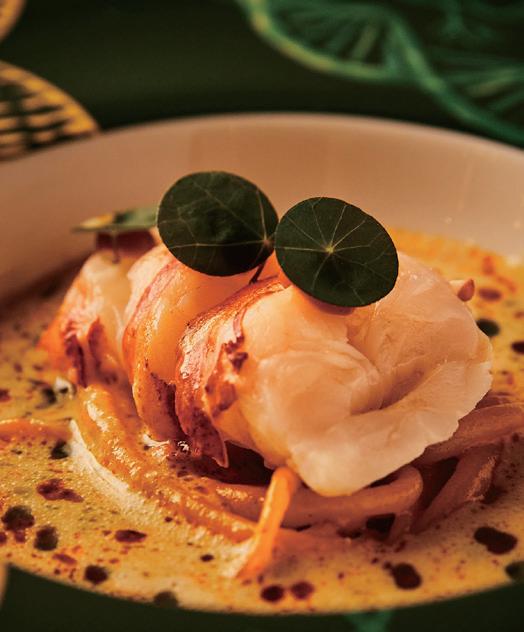 另外一碟名為「Hot Pot」的創意料理,主廚將 濃郁的麻辣火鍋湯底幻化成一顆飽滿的膠囊, 內裡暗藏伊比利亞豬肉、蒟蒻和培根脂,每一 口都濃縮了火鍋的靈魂,辛辣、鮮美和濃郁的 層次感瞬間在舌尖綻放,宛如火鍋的「濃縮精 華版本」,帶來驚喜十足的享受。而「laksa」 這道以馬來西亞特色為靈感的料理,使用來 自加拿大新斯科舍的龍蝦搭配銀針粉,加入 椰香濃郁的叻沙湯底與羅望子調味。另一道 「chicken mille-feuille」將白斬雞以分子料理 技法重新演繹,雞肉慕斯的輕盈與薑蔥醬的濃 郁形成對比,豐富的層次令人回味無窮。