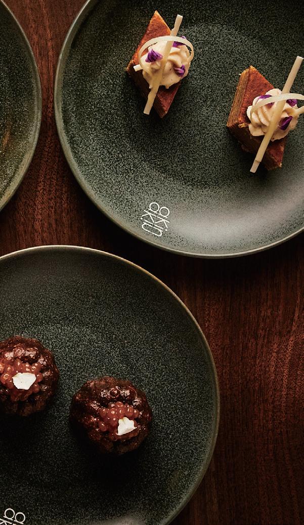 再如茶碗蒸這道日式經典料理,人們通常會以 滑嫩的蒸蛋為基底,搭配簡單的醬油和香菇 呈現。主廚則在蒸蛋中加入象拔蚌與北海道海 膽,輔以梅干與蘋果點綴,將日式的清淡層次 升華為豐富的對比,既有海洋的鮮美,也多了 一抹果香的清新。菠蘿包的重新詮釋則將傳統 與現代結合得淋漓盡致。菠蘿包原本是香港茶 餐廳經典的小吃,由鬆軟的麵包搭配酥脆的糖 皮構成。而在 aKin,這道點心採用法式奶油麵