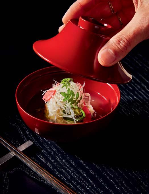 溢,肋眼肉油脂豐富,底層的竹筍炸天婦羅則帶來 爽脆口感。配以一小壺清澈晶瑩的玉露,味道甘甜 清爽,回味無窮。接下來是「御椀」湯品,盛裝在精 緻的漆器中。這碗湯以蕨菜、白蔥等當季蔬菜為主 要材料,搭配著烹調過的蛤蜊,散發出如雨後青草 的芬芳香氣。