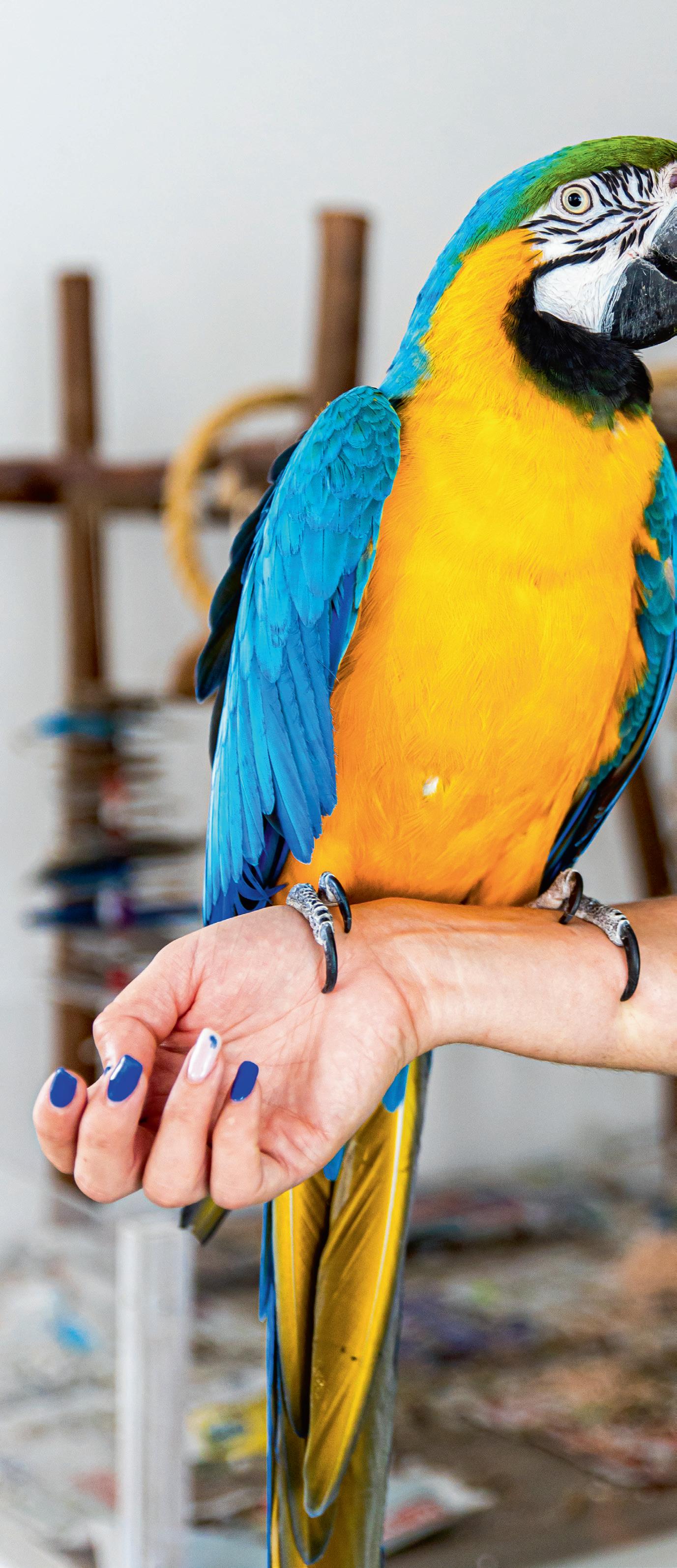 “Mijn blauwgele ara Maxi is onderdeel van ons gezin. Zij kwam als baby bij onze stichting terecht, gered uit een vreselijke situatie. Doordat ze veel te vroeg bij haar ouders was weggehaald, wist ze niet hoe ze een papegaai moest zijn. Hartverscheurend. We vingen haar op en onze ‘pleegmoeder-papegaai’ Okkie ontfermde zich over Maxi en later heb ik haar geadopteerd.
