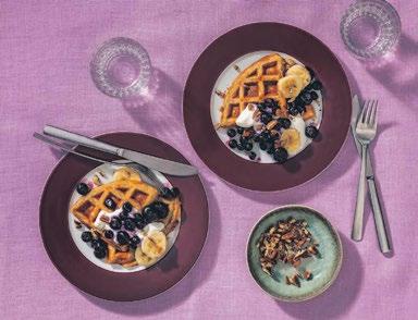• Halveer de wafels diagonaal. Verdeel de blauwe bessen, plakjes banaan en de rest van de skyr over de wafels. Hak de pecannoten grof en verdeel erover.