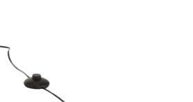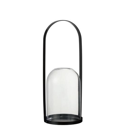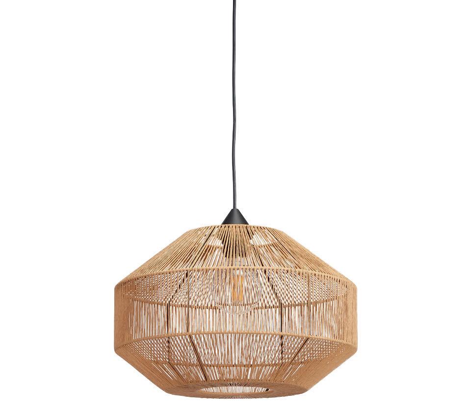 Uitgesproken hanglamp met schakelvormen en transparant zwarte kap met metalen ringen.