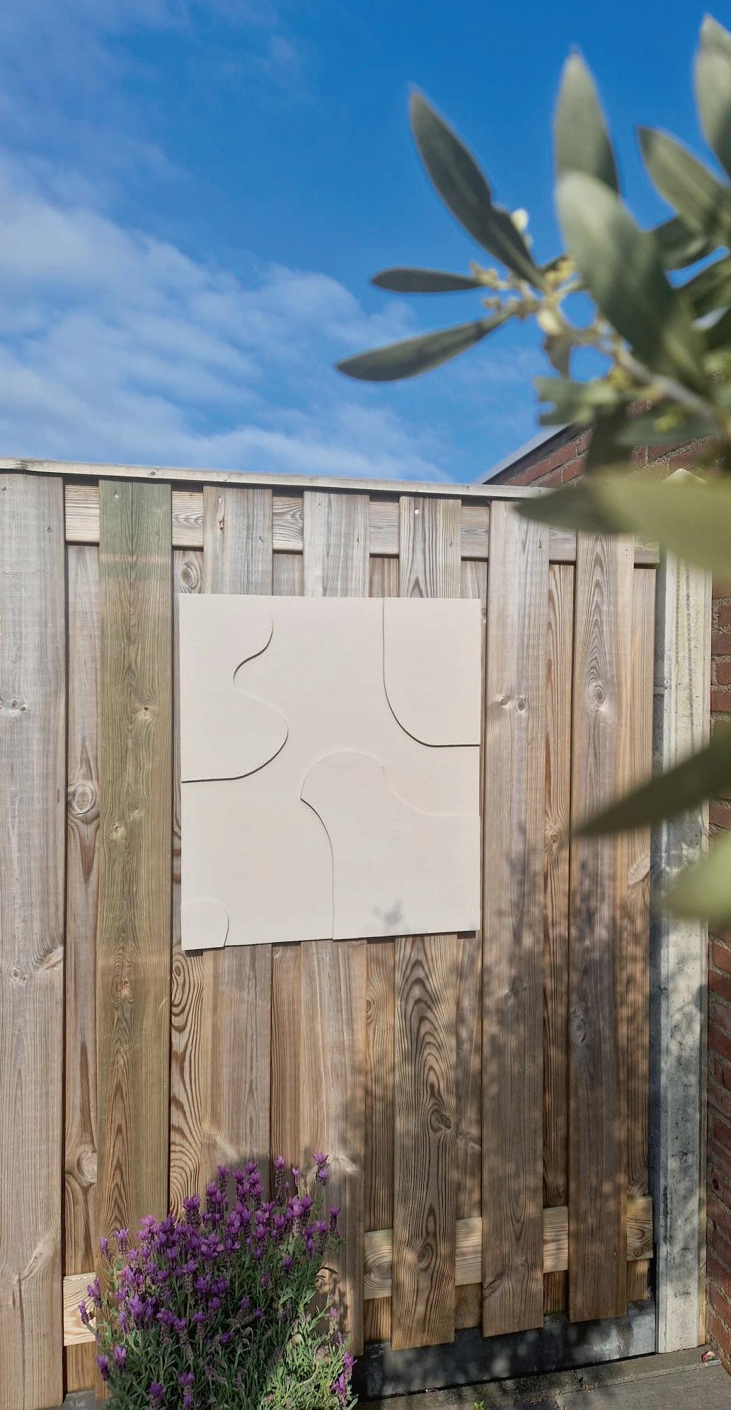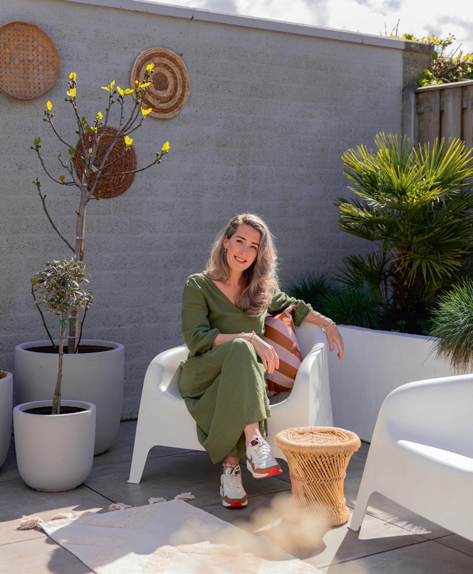 Ik heb met mijn interieur wel geleerd om verder te kijken en andere oplossingen te zoeken dan een accessoire weg te stoppen als het seizoen voorbij is. Zo liggen de kussen van binnen ook op de loungeset buiten. En het zou ook kunnen dat de vaas op de bijzettafel buiten, binnenkort op een plank in de woonkamer staat. Buiten ben ik vooral trots op de witte bloembakken die we zelf hebben gemaakt en voorzien van een stuclaag.”