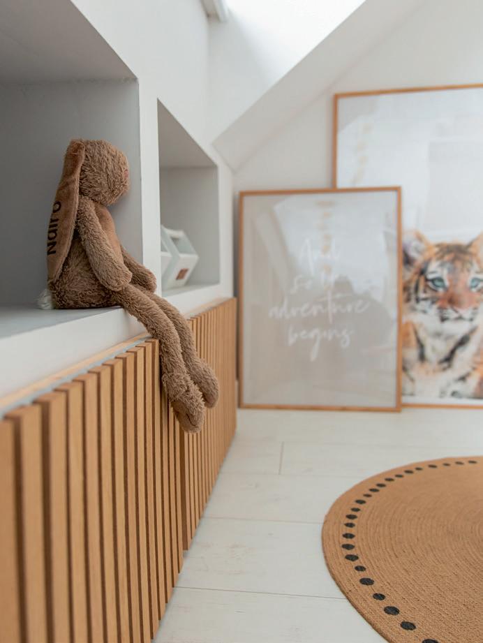 Hout is ook een veelvoorkomende grondstof in dit huis en meteen een mooie basis voor Estrella. “We zijn erg blij met de houten panelen aan de muur. We hebben bewust besloten om niet een hele muur vol te plakken. Weggooien, daar houden wij niet van. Daarom besloten we van het restant iets creatiefs te doen op de kinderkamers. De fronten van de lades, zijn eigenlijk de muurpanelen van beneden. Een warme en sfeervolle oplossing vinden wij.” Ook de vensterbanken, die in de meeste huizen wit zijn, heeft Estrella vervangen door hout. “Dit was een bureau in onze vorige woning. Een klein detail kan al zo’n groot verschil maken in een interieur.”