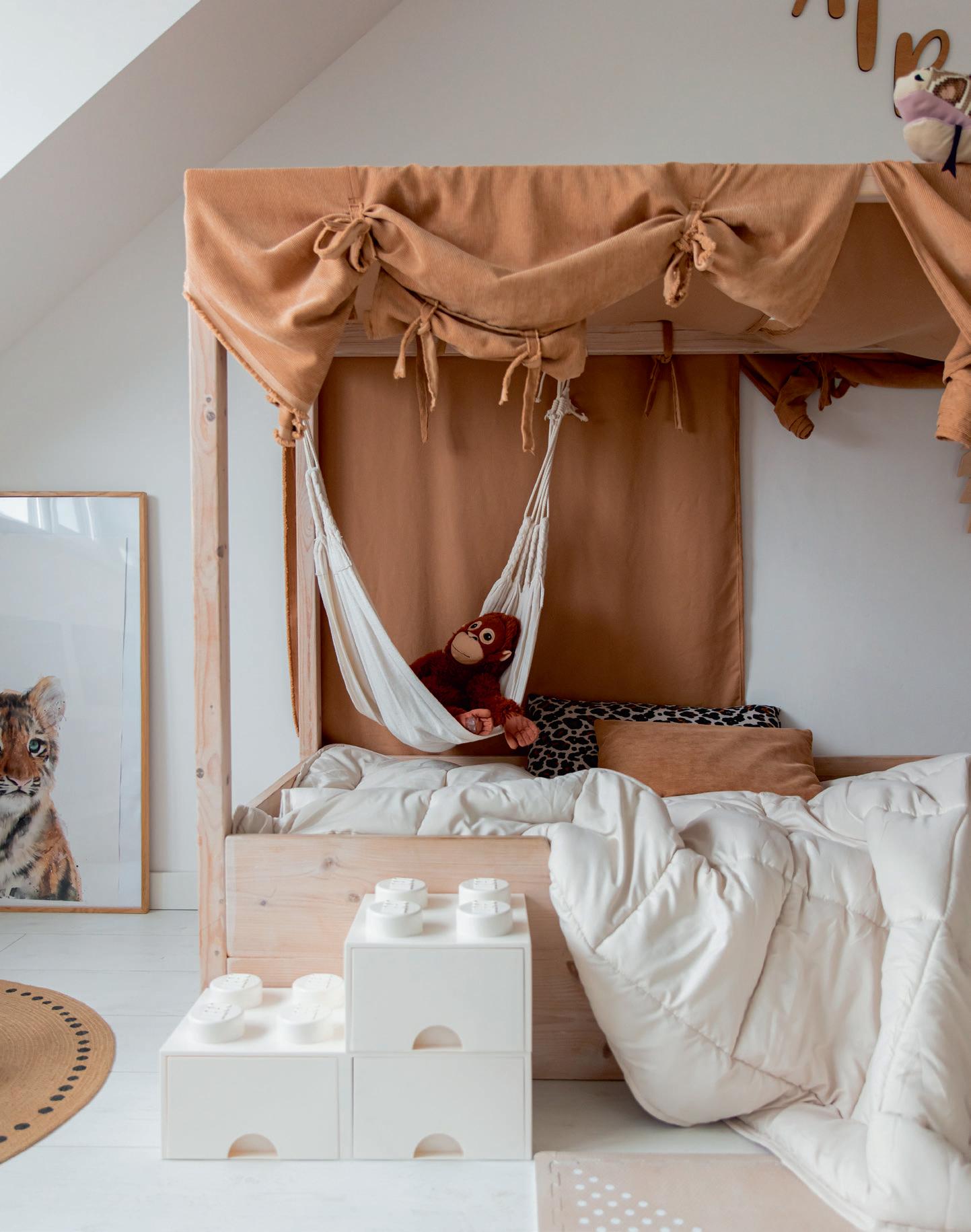 kamer komt het jungle-thema terug. Het houten bed waar voorheen een dak op zat, hebben we aangepakt en het laten lijken op een safaritent. Wanneer onze zoon aan de touwtjes trekt, valt het doek en lijkt het echt op een tent.”
